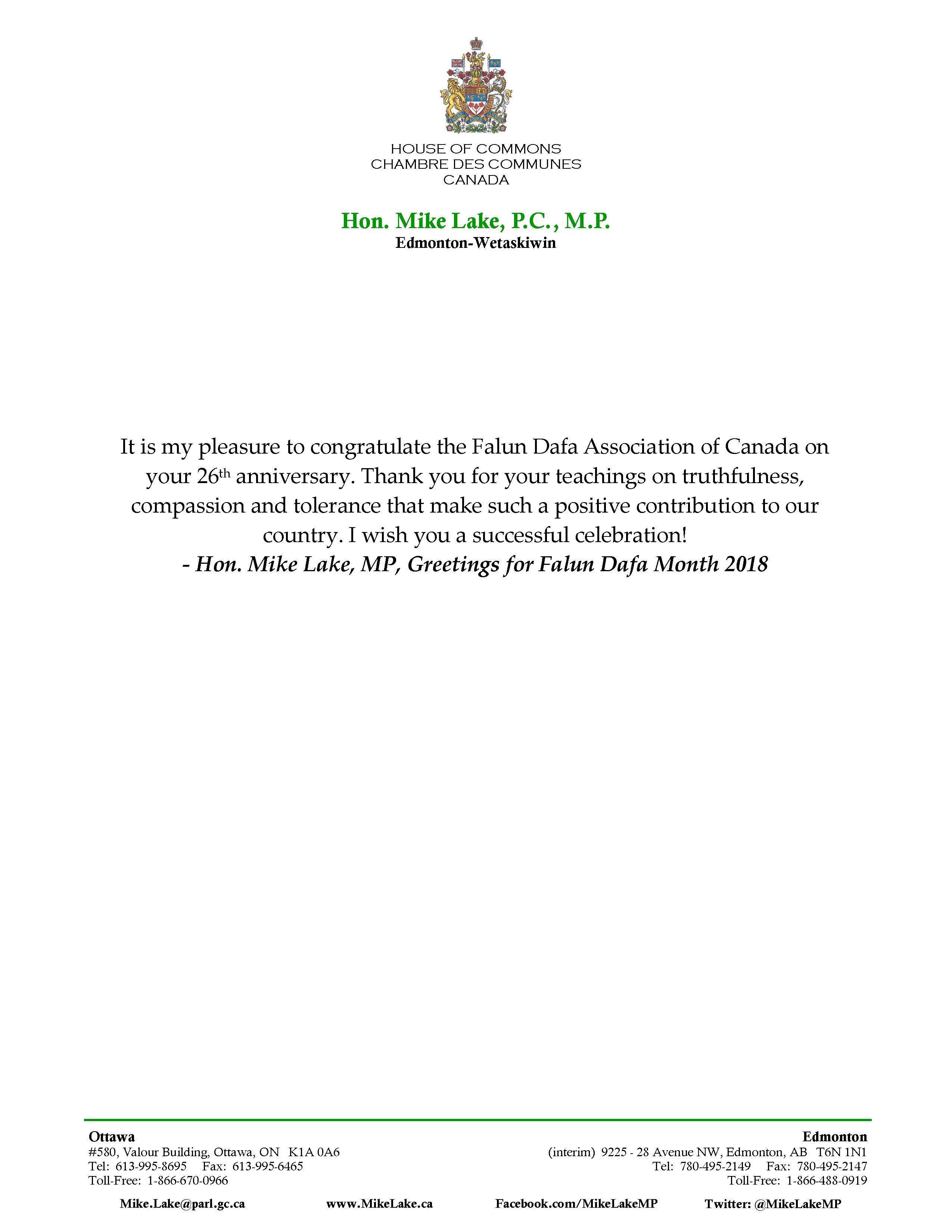 埃德蒙顿-韦塔斯基温选区国会议员Mike Lake在贺信中表示:“我很高兴祝贺加拿大法轮大法学会庆祝法轮大法洪传26周年。感谢你们传播的真、善、忍原则,对我们国家做出了如此积极的贡献。祝你们的庆祝活动成功!”
