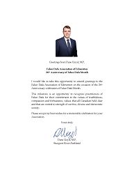 亚省省议员Jason Kenney在贺信中表示:“在法轮大法洪传二十六周年之际,我希望在此送上我诚挚温暖的祝贺!法轮大法真、善、忍的价值观让加拿大和世界其它地区受益非凡,籍此庆典的良机,人们认识到法轮大法学员带给社会的和谐、宽容和关爱。
