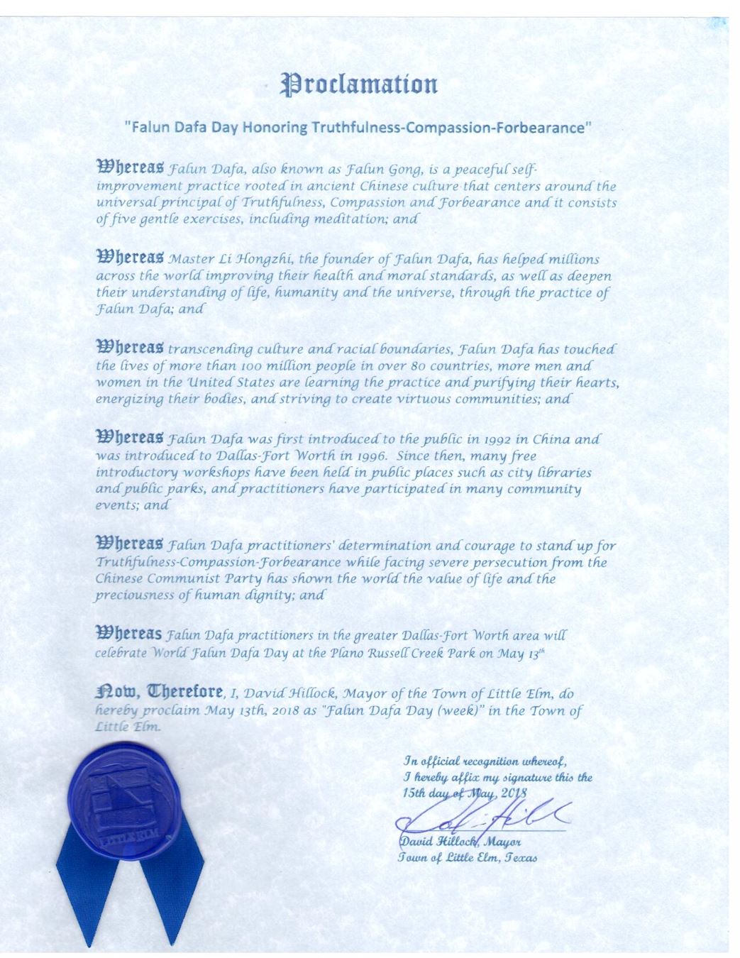 ![]() 图:美国德州小榆树市(Little Elm)宣布“法轮大法日” |