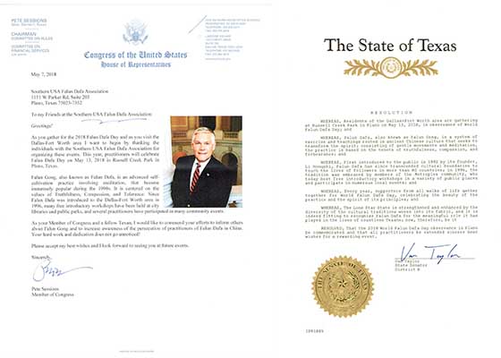 五月十三日是世界法轮大法日,德州第三十二选区国会议员彼得·赛申斯为活动发来贺信。德州州参议员万·泰勒也颁发决议案庆祝世界法轮大法日。