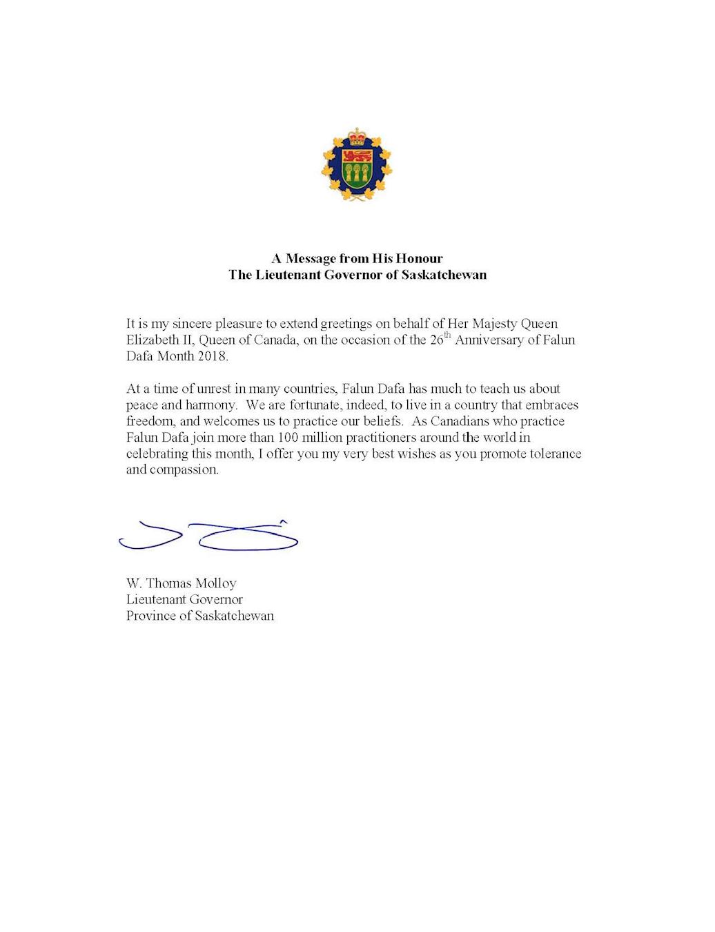 萨斯喀彻温省(Saskatchewan)省督Thomas Molloy为法轮大法月发来贺信:“在2018年庆贺法轮大法月之际,谨代表加拿大女王——伊丽莎白二世,我非常荣幸能送上祝福。”