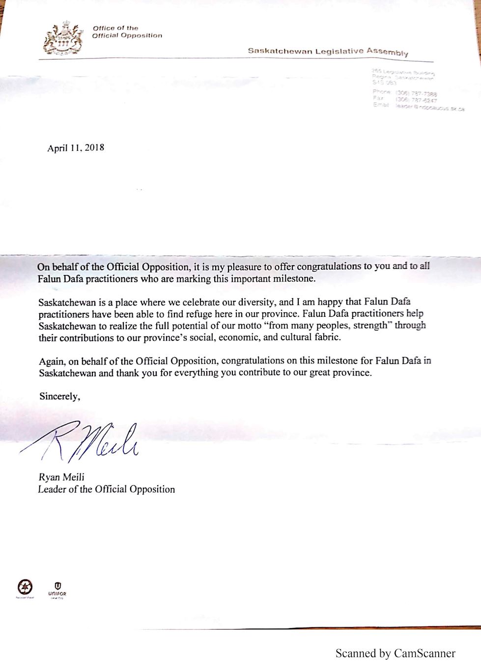 萨斯喀彻温省反对党领袖Ryan Meili发出贺信表示:“谨代表反对党,我非常荣幸能向你们所有法轮大法修炼者表达问候。”