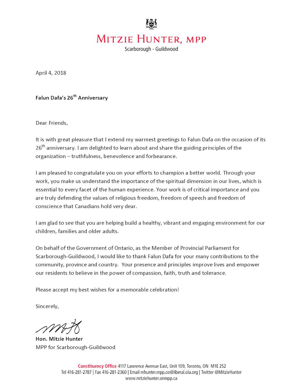 安省教育厅厅长、安省士嘉堡-桂活特(Scarborough-Guildwood)选区省议员康德莹(Mitzie Hunter)为法轮大法传世26周年发来贺信。