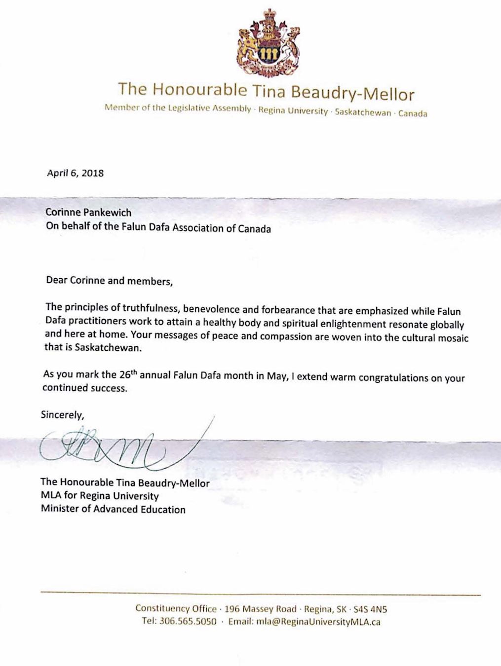 萨斯喀彻温省高等教育厅长Tina Beaudry-Mellor为法轮大法月发出贺信表示,“在全球和当地的法轮大法修炼者想要达到健康身体和精神提升的同时,他们强调遵循‘真、善、忍’的准则。你们关于平和与大善的信息已融为萨省文化马赛克的一部份。”