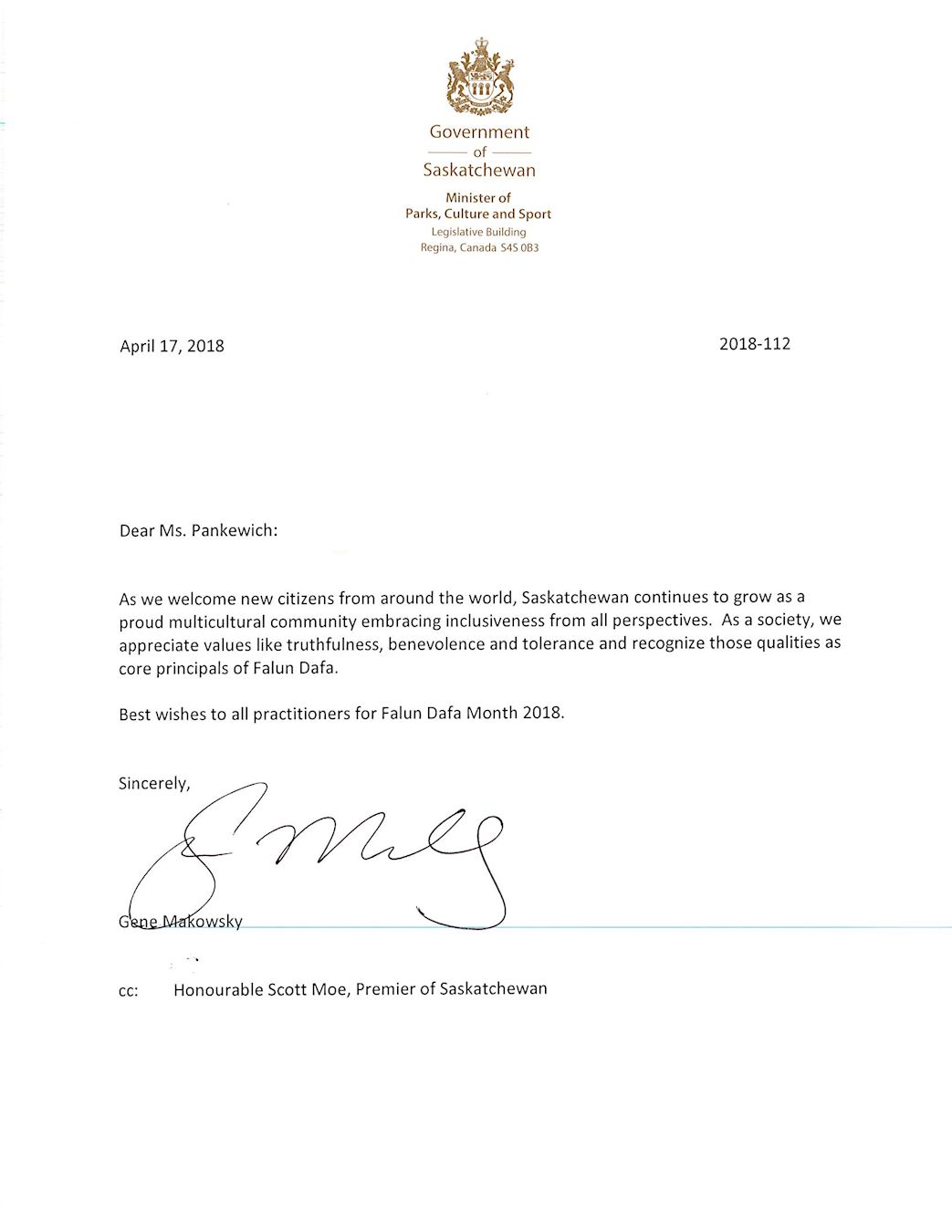 萨斯喀彻温省文化厅厅长、省议员Gene Makowsky发来贺信表示:“我们感谢‘真、善、忍’的价值观,这正是法轮大法的基本理念。”