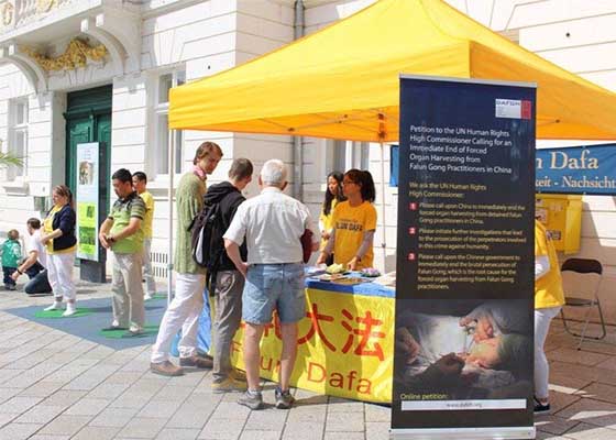 - 维也纳小城喜迎法轮大法(图)- 五月十九日,奥地利传统小城巴登的民众有机会了解到法轮功被迫害的真相。人们在了解了真相后纷纷对法轮功学员制止迫害表示支持。