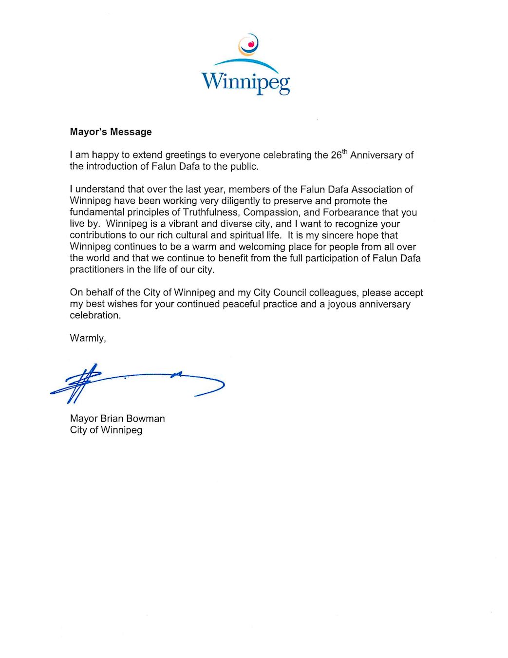 贺信说:“谨代表温尼伯市和我的市府同仁,请接受我最真挚的祝愿,祝愿你们继续(修炼)这个平和的功法,祝你们有一个充满乐趣的周年庆典。”