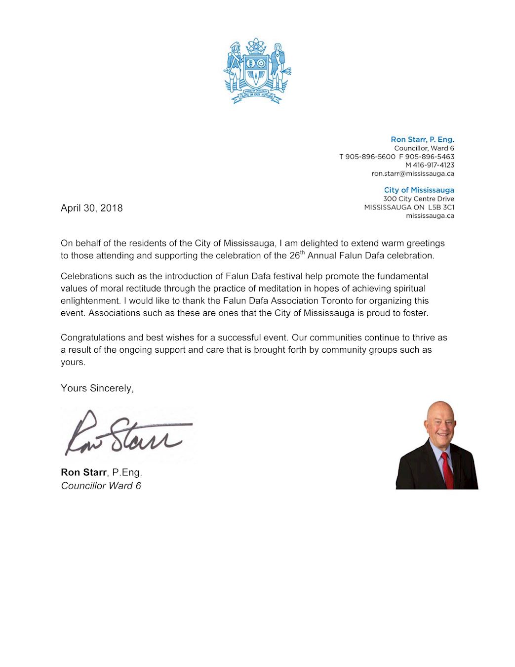 大多伦多地区密西沙加市第六区市议员斯塔(Ron Starr)在贺信中说:“谨代表密西沙加市的民众,我非常高兴地向所有参加和支持法轮大法传世26周年庆典活动的人们表达我的热情问候。”
