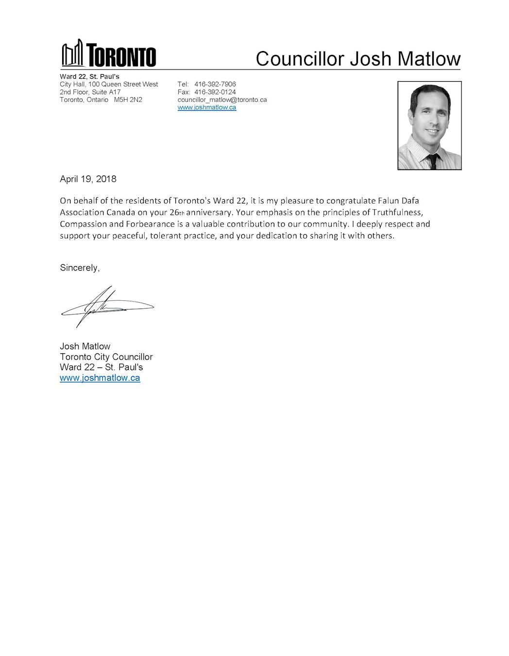 ![]() 图8:多伦多市议员Josh Matlow的贺信 |