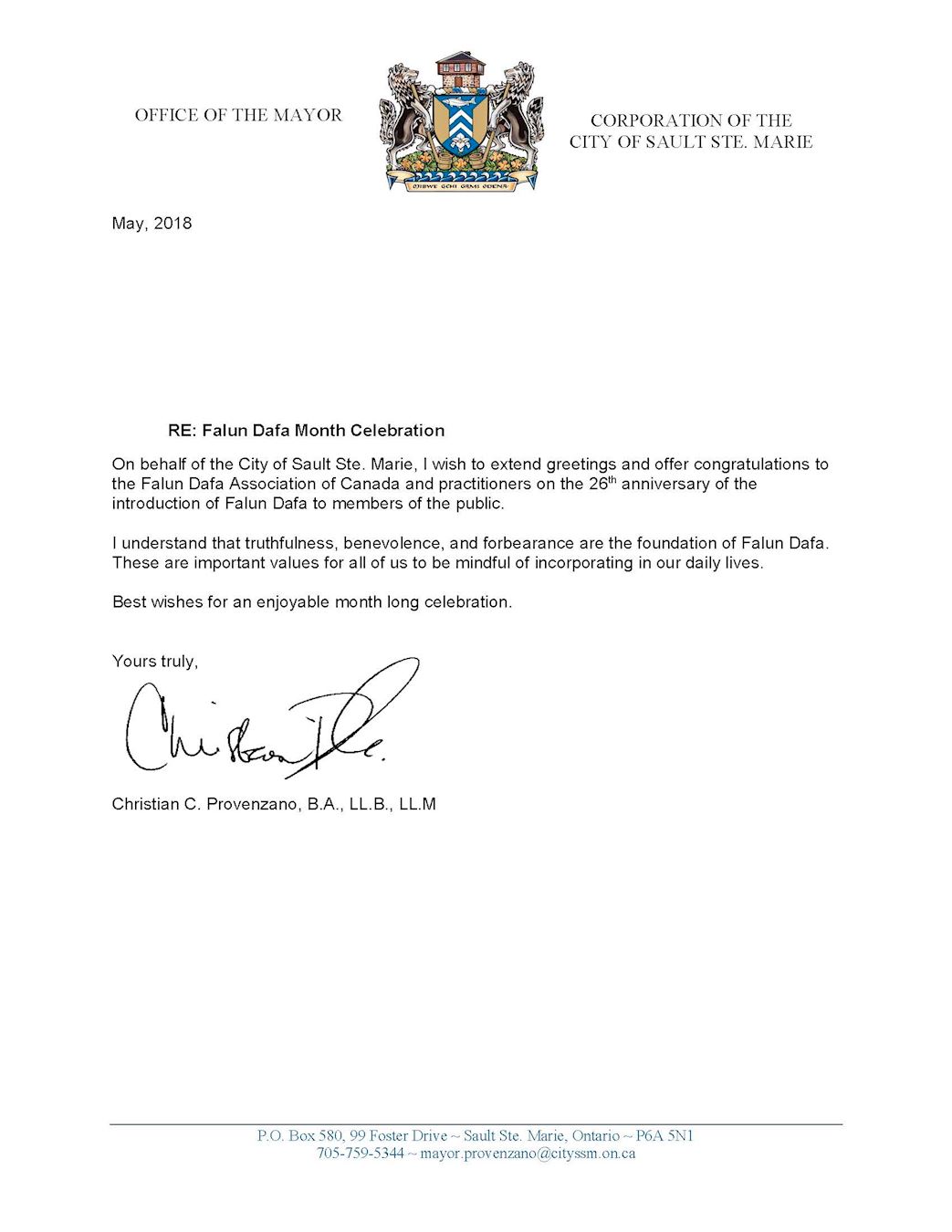 安河北部城市苏圣玛丽(Sault Ste. Marie)市长Christian Provenzano为法轮大法日发出贺信表示:“谨代表Sault Ste. Marie市,在法轮大法传世26年之际,我要向加拿大法轮大法学会和法轮功修炼者表达我的祝贺和问候。”