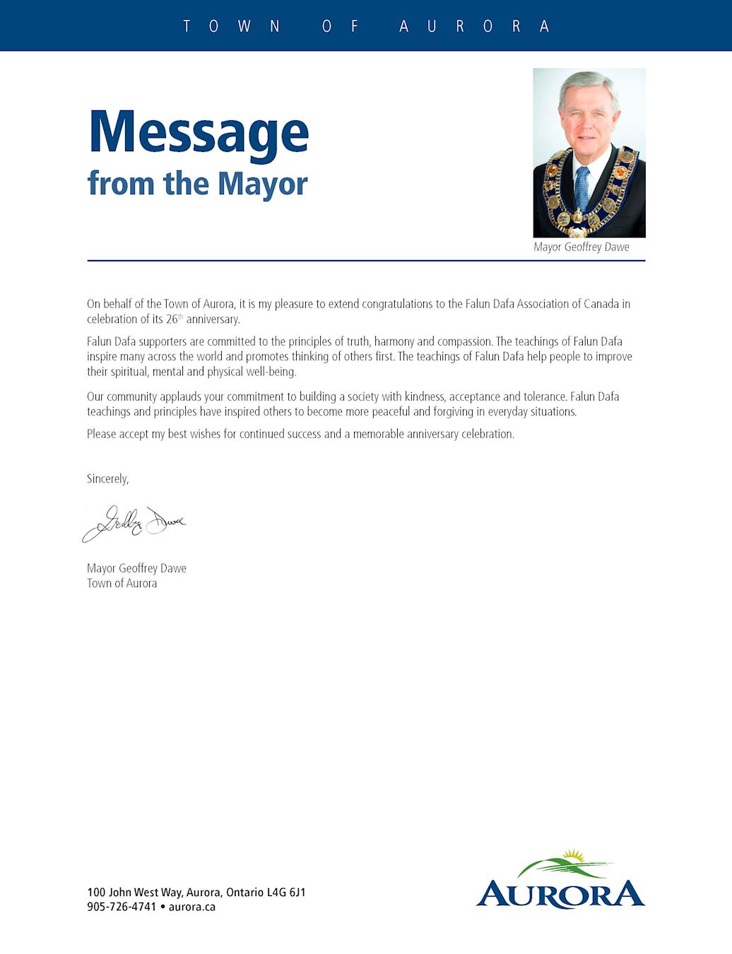 安河奥罗拉市(Aurora)市长捷夫瑞•道威(Geoffrey Dawe)在贺信中写道:“谨代表奥罗拉市,我很高兴在此向加拿大法轮大法学会举办的26周年庆祝活动致以祝贺。 ”