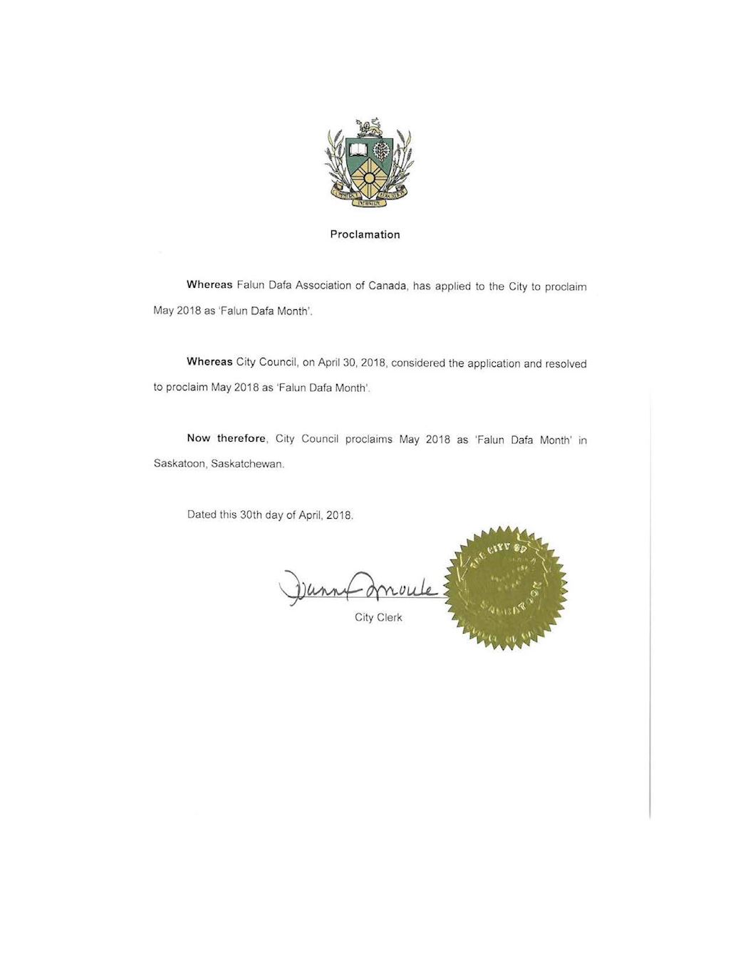 萨斯喀彻温省萨斯卡通市近日为法轮大法发出褒奖信,并宣布2018年5月为法轮大法月。