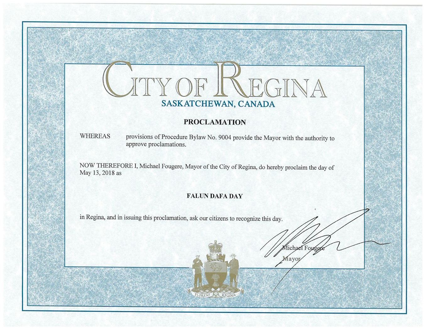 萨斯喀彻温省省会–里贾纳市(Regina)市长Michael Fougere褒奖法轮大法,并宣布2018年5月13日为法轮大法日。