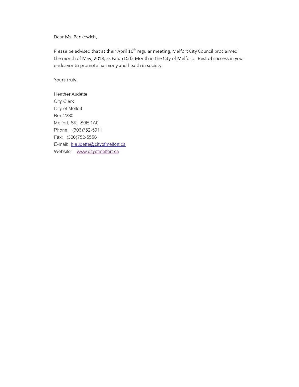 萨斯喀彻温省Melfort市近日为法轮大法发出褒奖,并宣布2018年5月为该市的法轮大法月。褒奖信中说:“祝愿你们在社会中洪扬谐和与健康获得成功!”