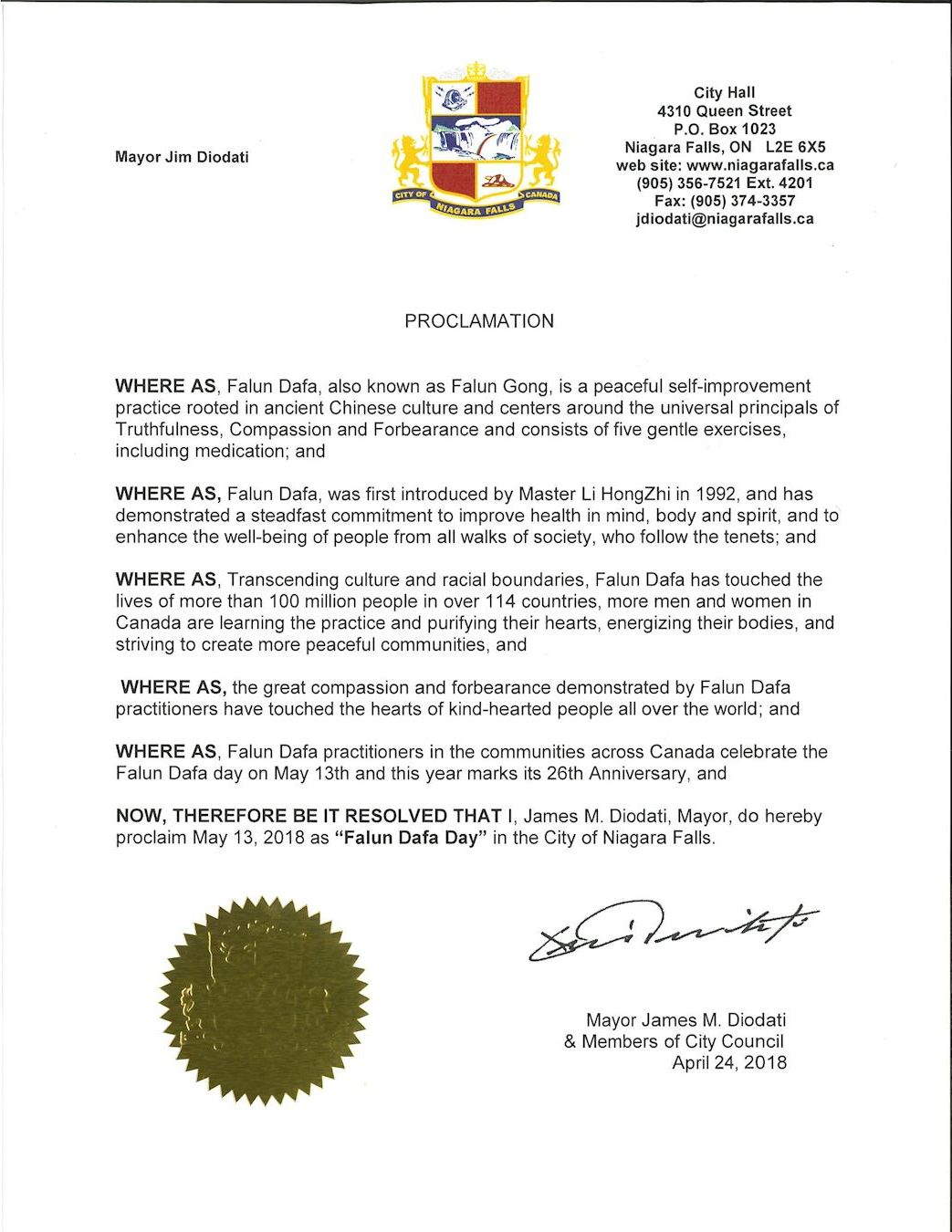安河Niagara Falls市刚刚通过决议,褒奖法轮大法,并宣布2018年5月13日为该市的法轮大法日。
