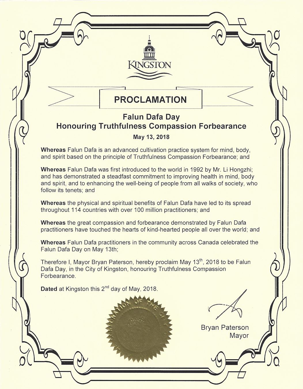 安大略省金斯敦市宣布二零一八年五月十三日为“法轮大法日”,颂扬“真善忍”的原则。金斯敦市已连续十年褒奖法轮大法日。