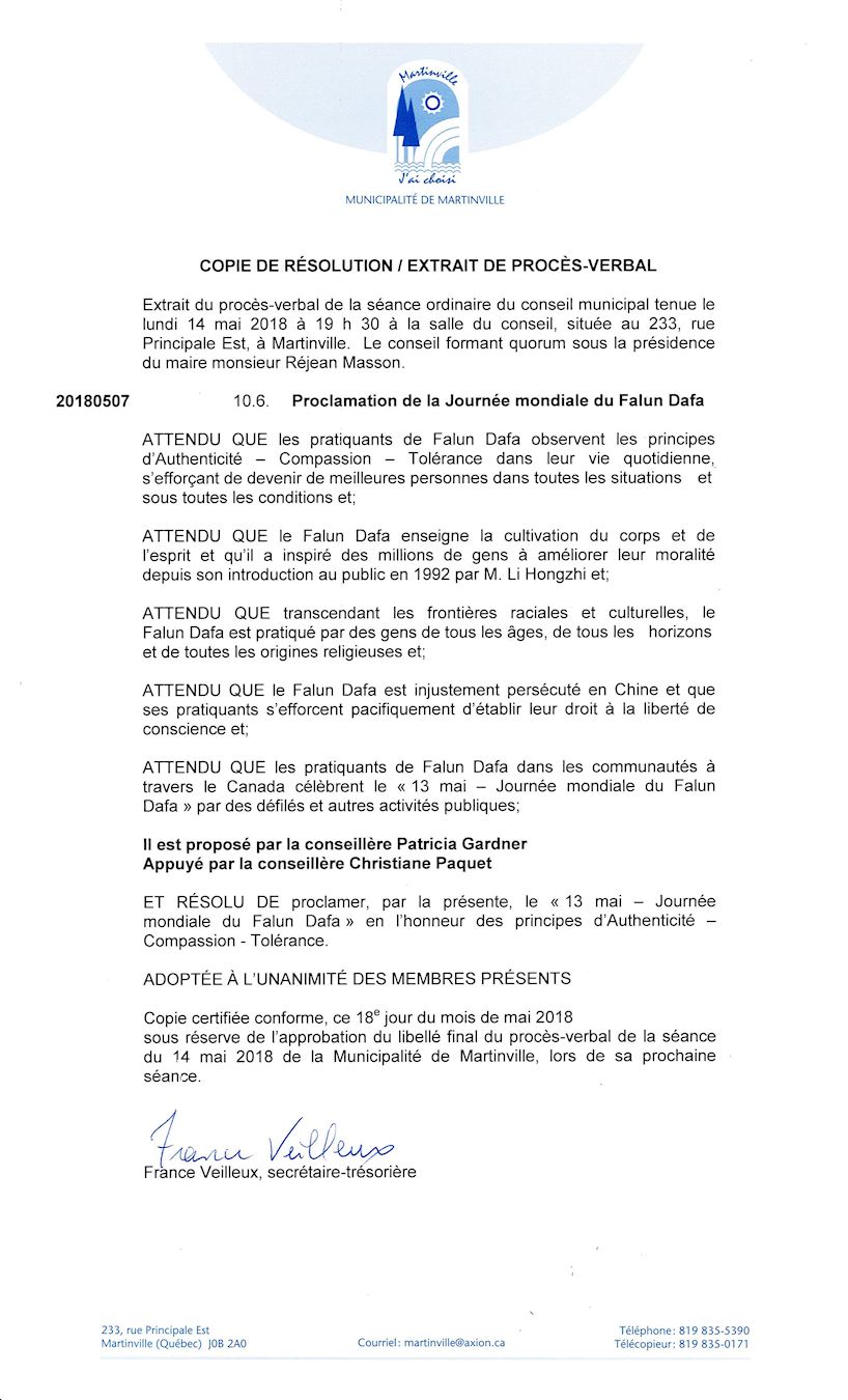 位于加拿大魁北克省东部Eastern Townships的马丁维拉市(Martinville)颁发褒奖,宣布5月13日为当地的法轮大法日,以赞颂法轮大法的真、善、忍原则。