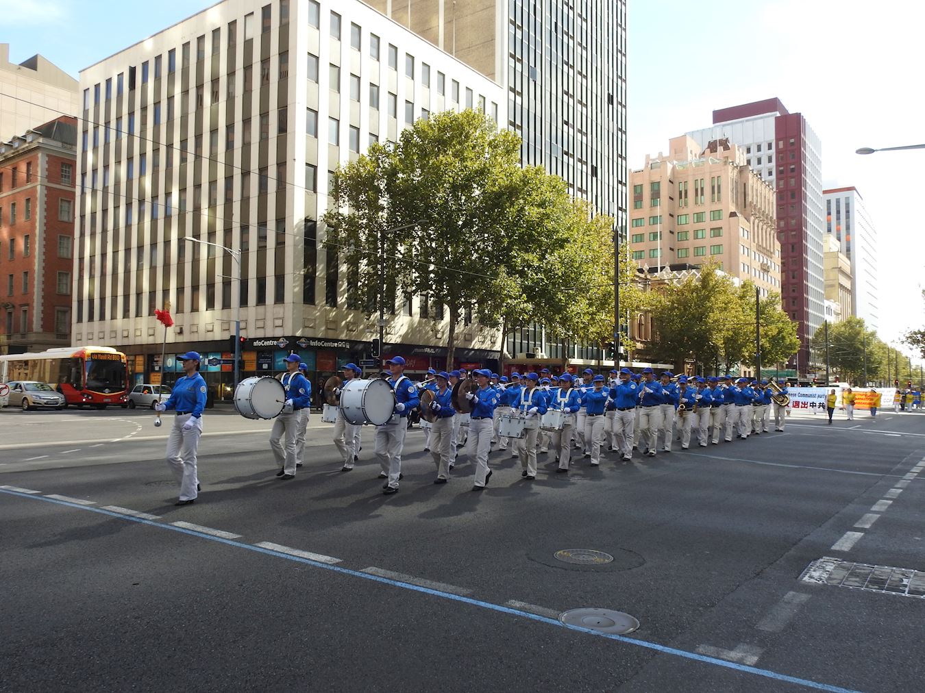 上午十一点,游行从北大街南澳总督府前出发,经市中心威廉王大道,到唐人街结束。当天的游行队伍由“澳洲法轮大法天国乐团”引领,向各界民众展示了以“反迫害”、“声援三退”为主题的横幅。