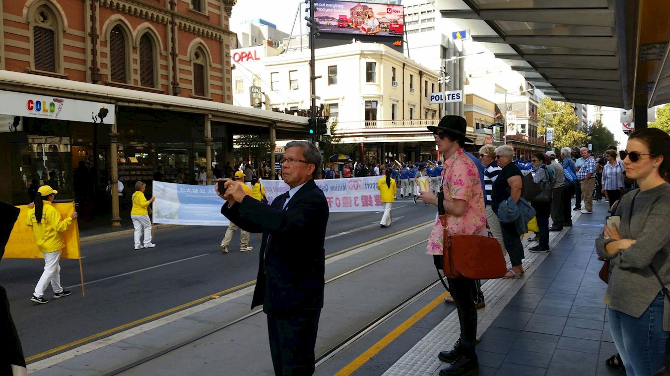 图2:南澳首府阿德莱德市中心,民众驻足观看声援三亿人三退的游行队伍