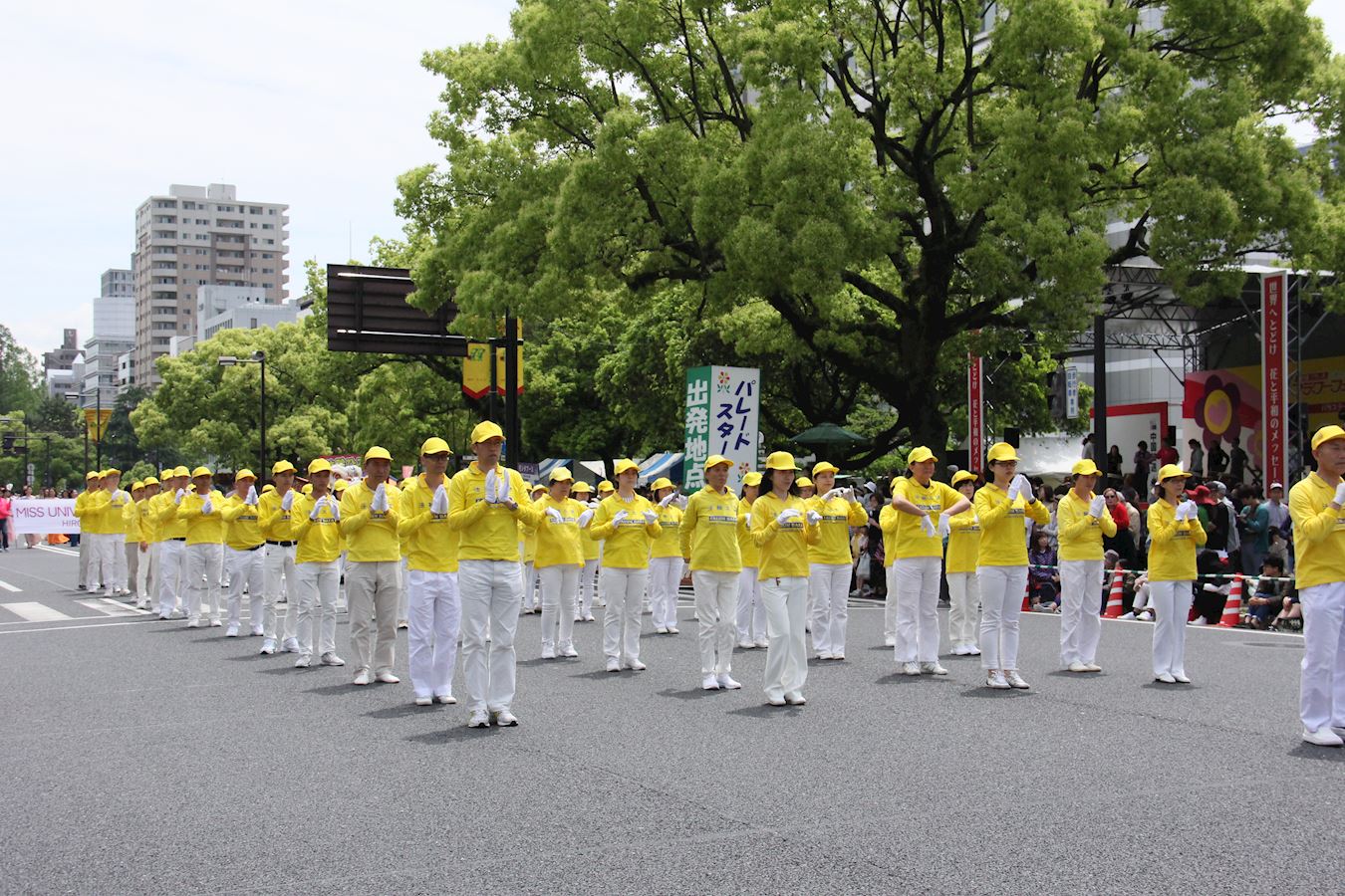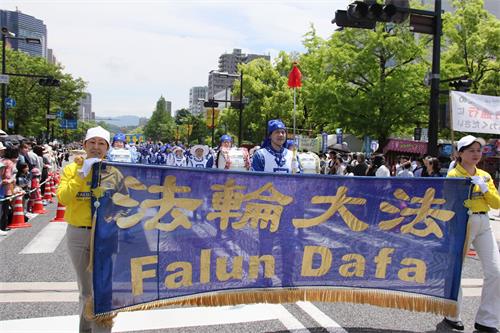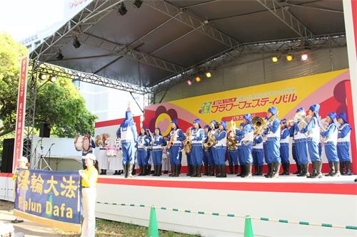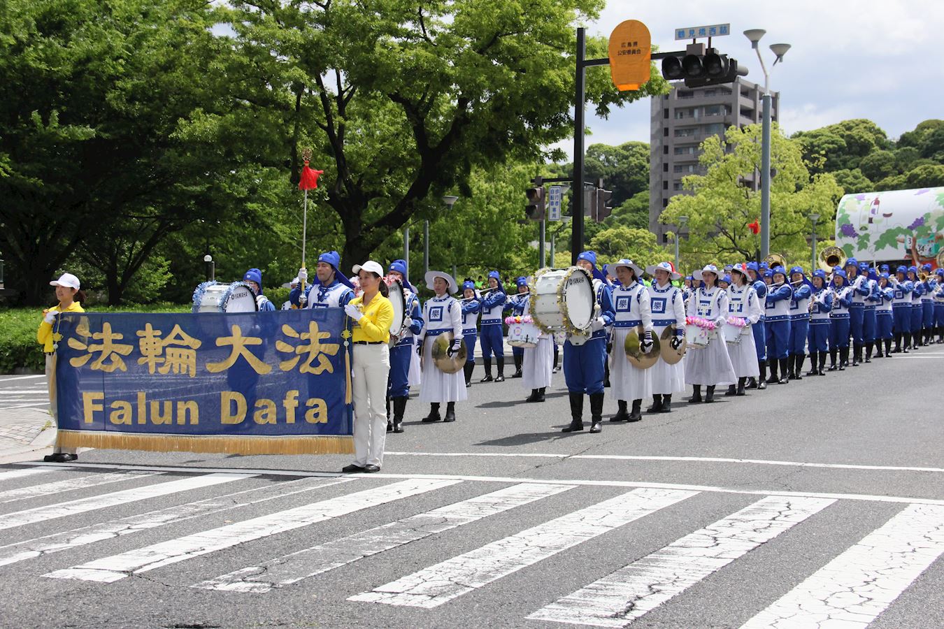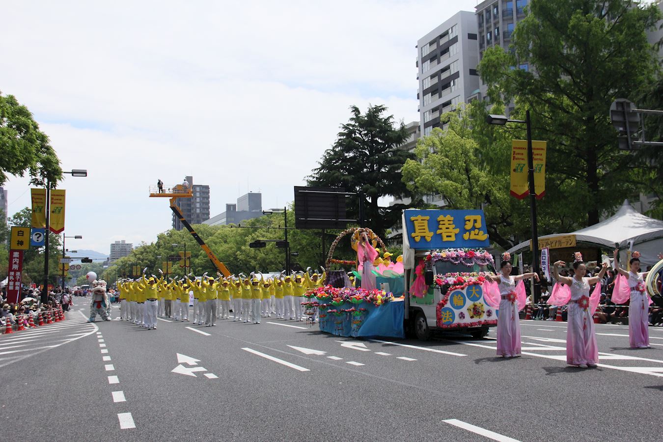图1~7:法轮功学员参加第四十二届日本广岛鲜花节综合队列表演原本预报的阴雨天气,迎来的却是碧空万里,这给人们带来了意外的惊喜。一百一十一个团体组成的鲜花综合队列行进表演中,法轮功的队伍尤为令人瞩目,气势磅礴的天国乐团演奏,印有“真善忍”、“法轮大法好”的精美花车,法轮功功法演示、仙女舞和狮子舞等,无不赢得观众喝彩。队列行进表演结束后,法轮功团体又应邀参加了舞台表演,受到人们的欢迎。