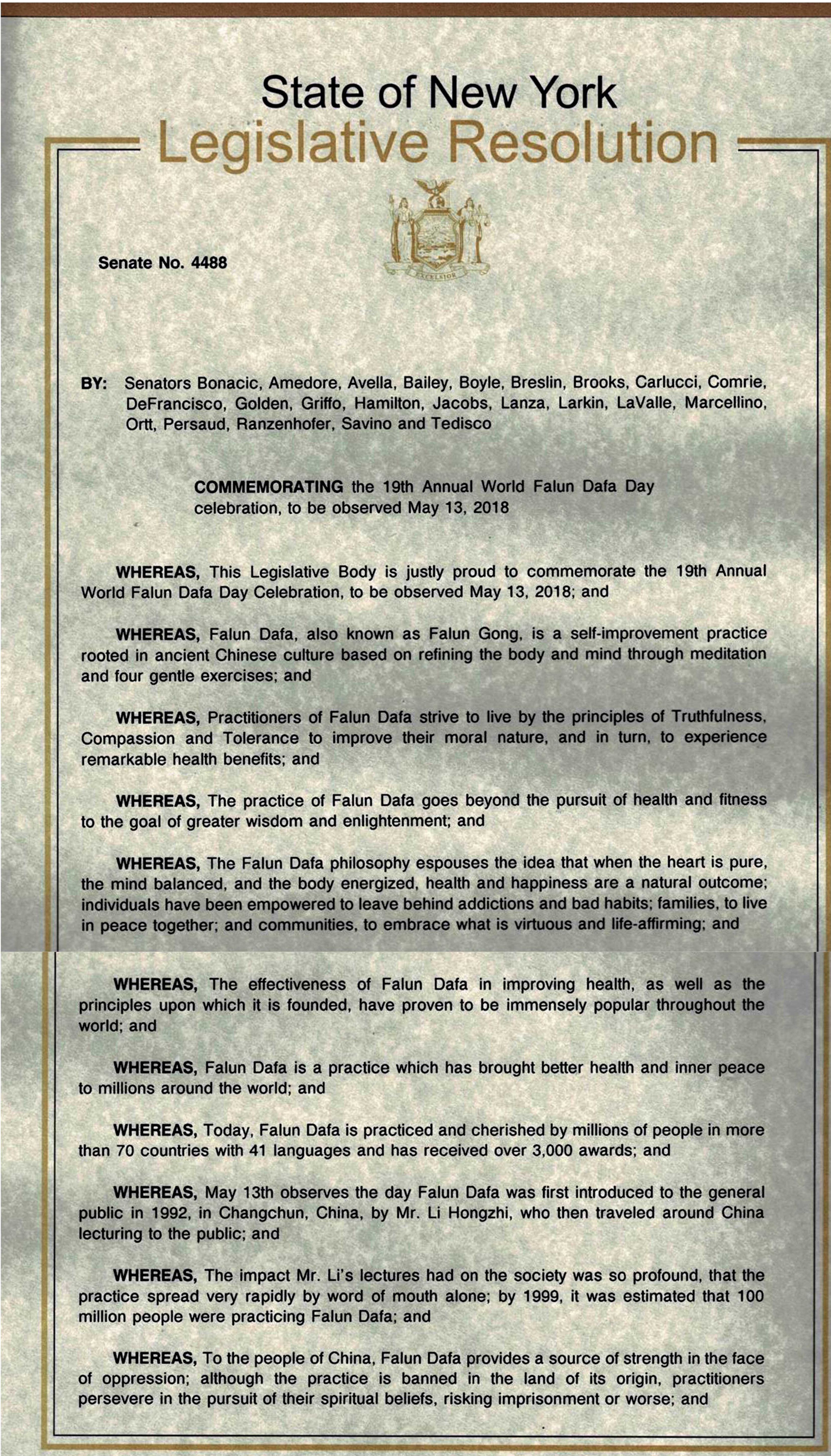 二零一八年四月十七日,美国纽约州参议院全体通过4488号决议案,恭贺“二零一八年五月十三日,第十九届世界法轮大法日的庆典”。这是纽约州参议院连续第八年通过决议案,表彰“世界法轮大法日”。决议案由纽约州第四十二选区参议员约翰·博纳西奇(John J. Bonacic)发起,二十二个参议员共同签署赞成。 参议员博纳西奇在参议院全体会议上宣读并通过。