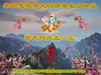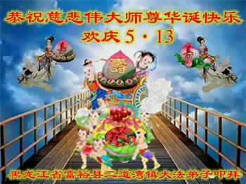 - 齐齐哈尔大法弟子恭贺世界法轮大法日暨师尊华诞(20条)- 黑龙江省齐齐哈尔市富裕县二道镇大法弟子恭祝师尊华诞快乐!普天同庆5·13世界法轮大法日!真善忍好真诚敬师一片心善良慈悲多救人忍让和谐无争斗好有好报福满门黑龙江省齐齐哈尔富区学法小组大法弟子恭祝师尊生日快乐!及恭贺法轮大法日!感谢师尊的慈悲苦度。