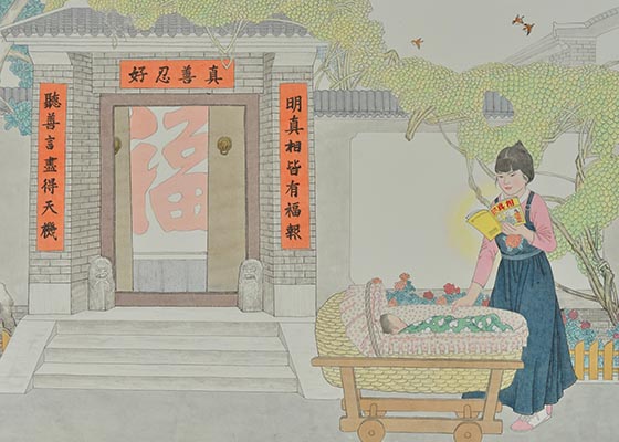 - 【庆祝513】绘画:天赐洪福- 一座农舍前,年轻的媳妇推着摇篮,正在阅读一本讲述法轮功真相的期刊。庭院内墙上是一个大大的“福”字,院门两旁有一副对联:听善言尽得天机,明真相皆有福报,横批:真善忍好。