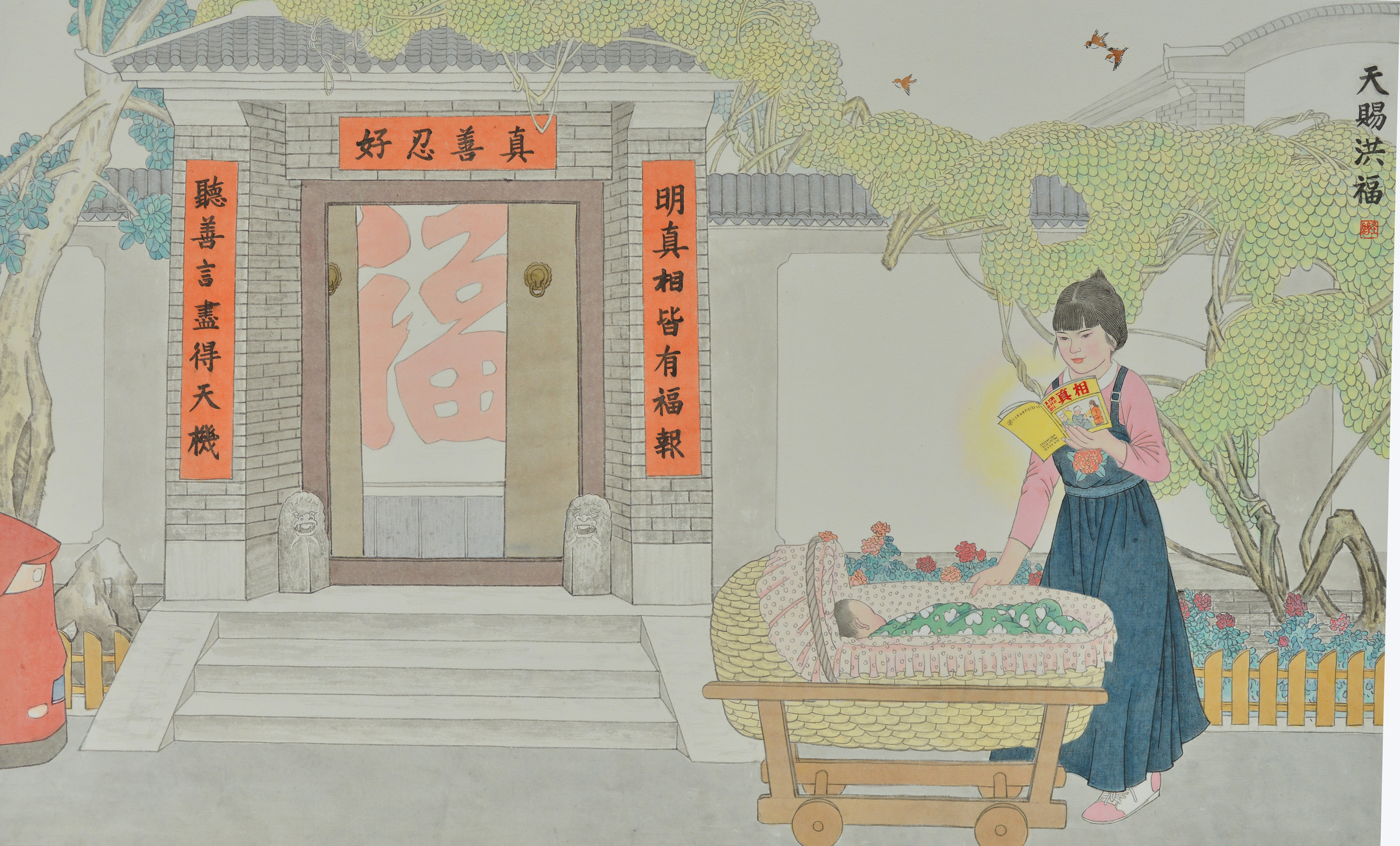 【明慧网二零一八年五月九日】一座农舍前,年轻的媳妇推着摇篮,正在阅读一本讲述法轮功真相的期刊。庭院内墙上是一个大大的“福”字,院门两旁有一副对联:听善言尽得天机,明真相皆有福报,横批:真善忍好。