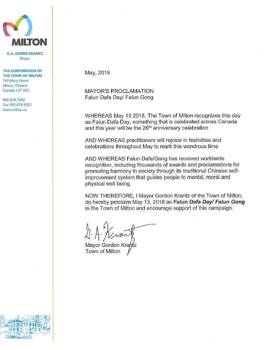 安省米尔顿(Milton)市长克兰茨(Gordon Krantz)宣布2018年5月13日为米尔顿法轮大法日,并褒奖法轮大法。