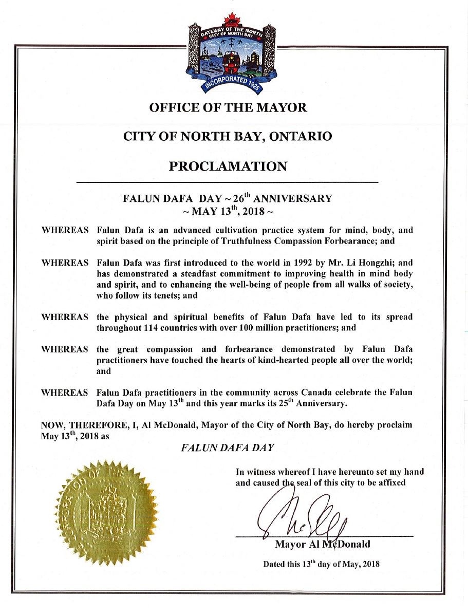 安省北湾(North Bay)市长Al McDonald宣布2018年5月13日为法轮大法日。