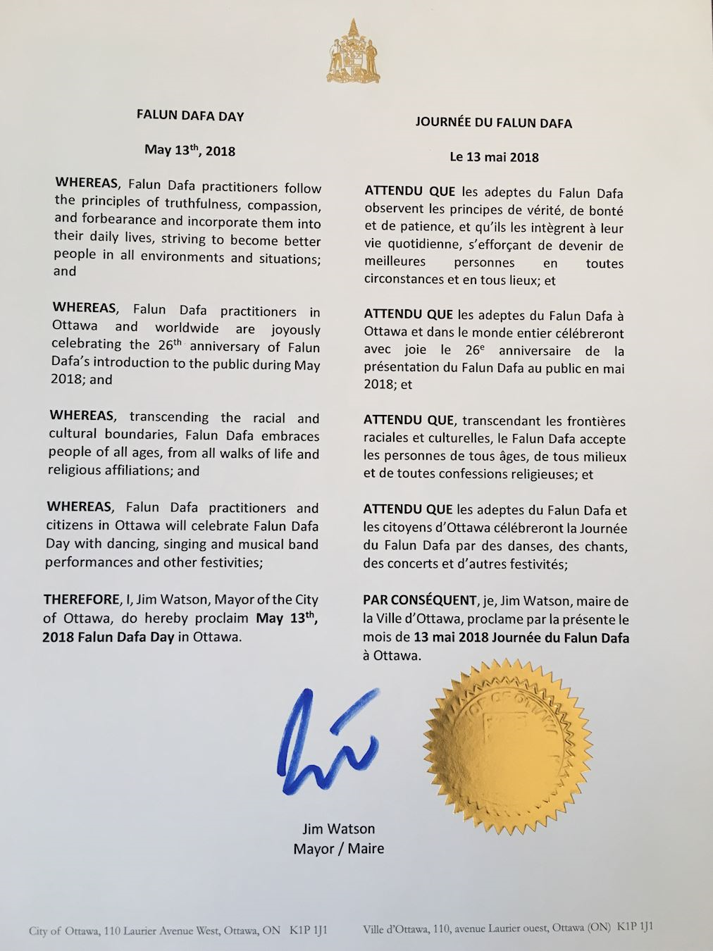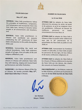 因此,我,吉姆·沃森,渥太华的市长,宣布二零一八年五月十三日为“渥太华法轮大法日”。