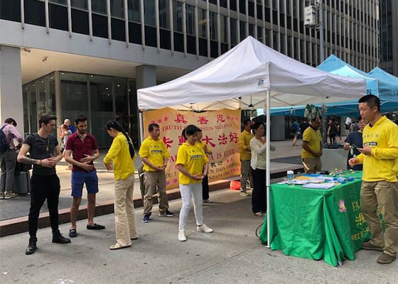 - 在纽约街市上介绍法轮功(图)- 一年一度的纽约街市开始了,此次街市于二零一八年六月二日在曼哈顿中城六大道举办,街市横跨十几条街,街市上很热闹。