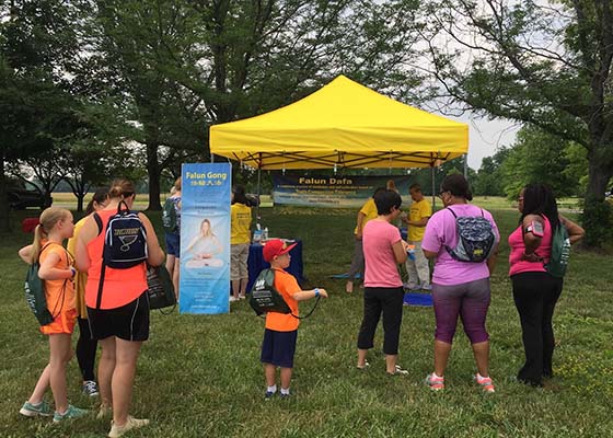 6月9日,美国密苏里州圣路易市法轮功学员连续第三年参加在克瑞吾科尔湖边举办的户外运动节,向民众介绍功法。