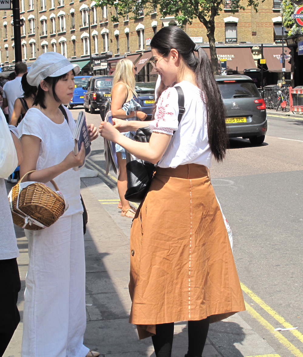 图4:二零一八年六月三日,在伦敦特拉法加广场,住在北英格兰、在星巴克公司工作的尼基•贝尔(右)向法轮功学员铭慧深入了解真相