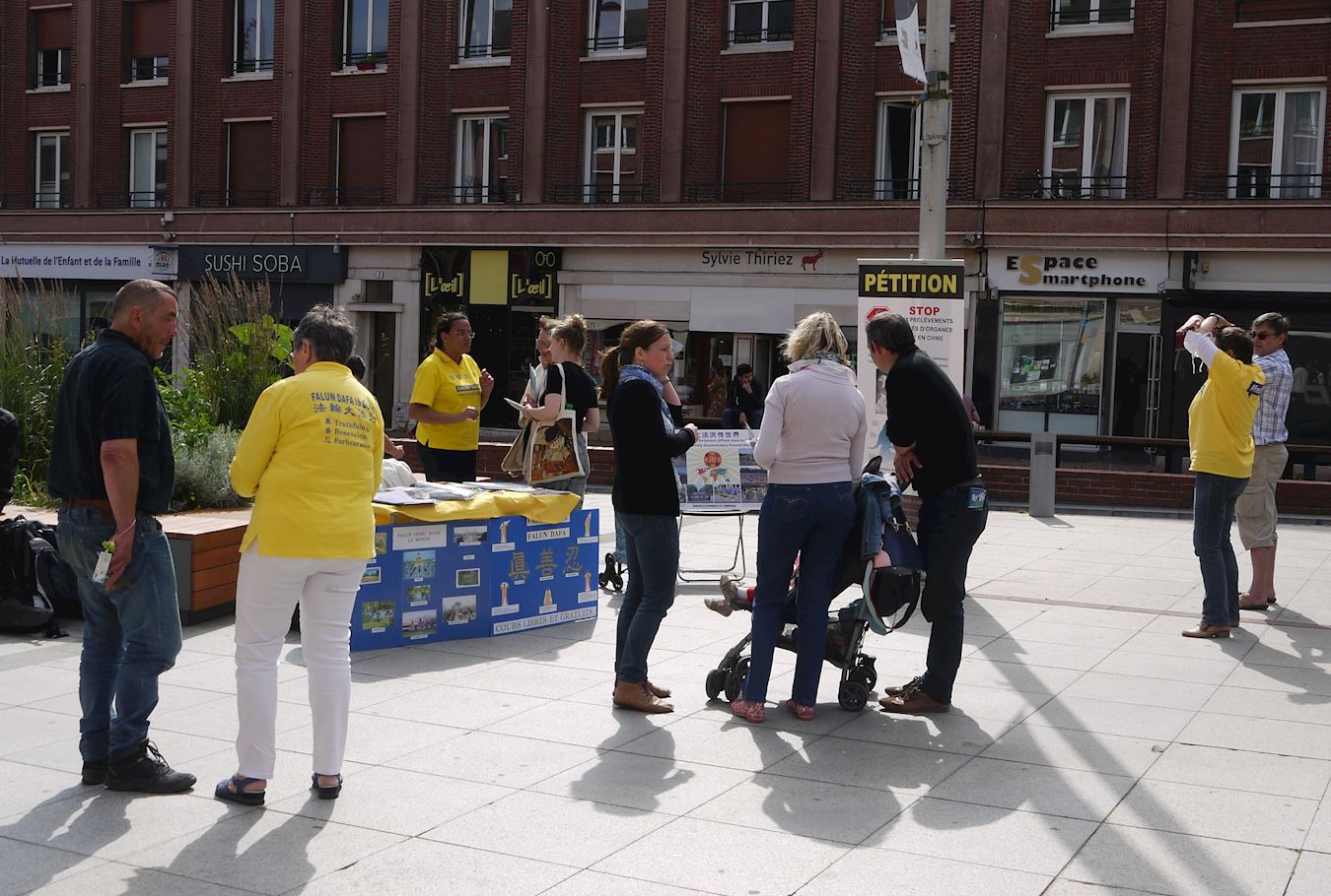 ![]() 图4:法国阿密安市政府广场上,游人驻足了解法轮功,签名支持法轮功反迫害 |