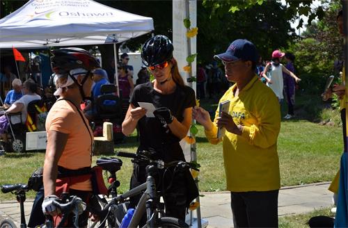 ![]() 图4:加拿大奥沙瓦牡丹节上,安德烈(Andre)先生听法轮功学员介绍功法 |
