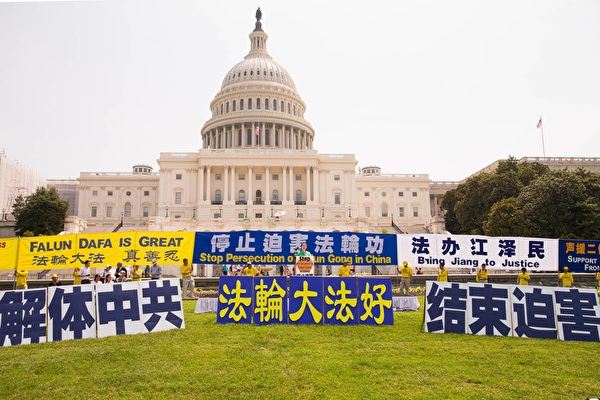 图1:二零一八年六月八日,美国联邦众议员达纳·罗拉巴克(Dana Rohrabacher)发起《第932号决议案》,声援中国退党潮,要求中共立即停止迫害法轮功。图为二零一七年在美国国会山,法轮功学员举行反迫害集会。