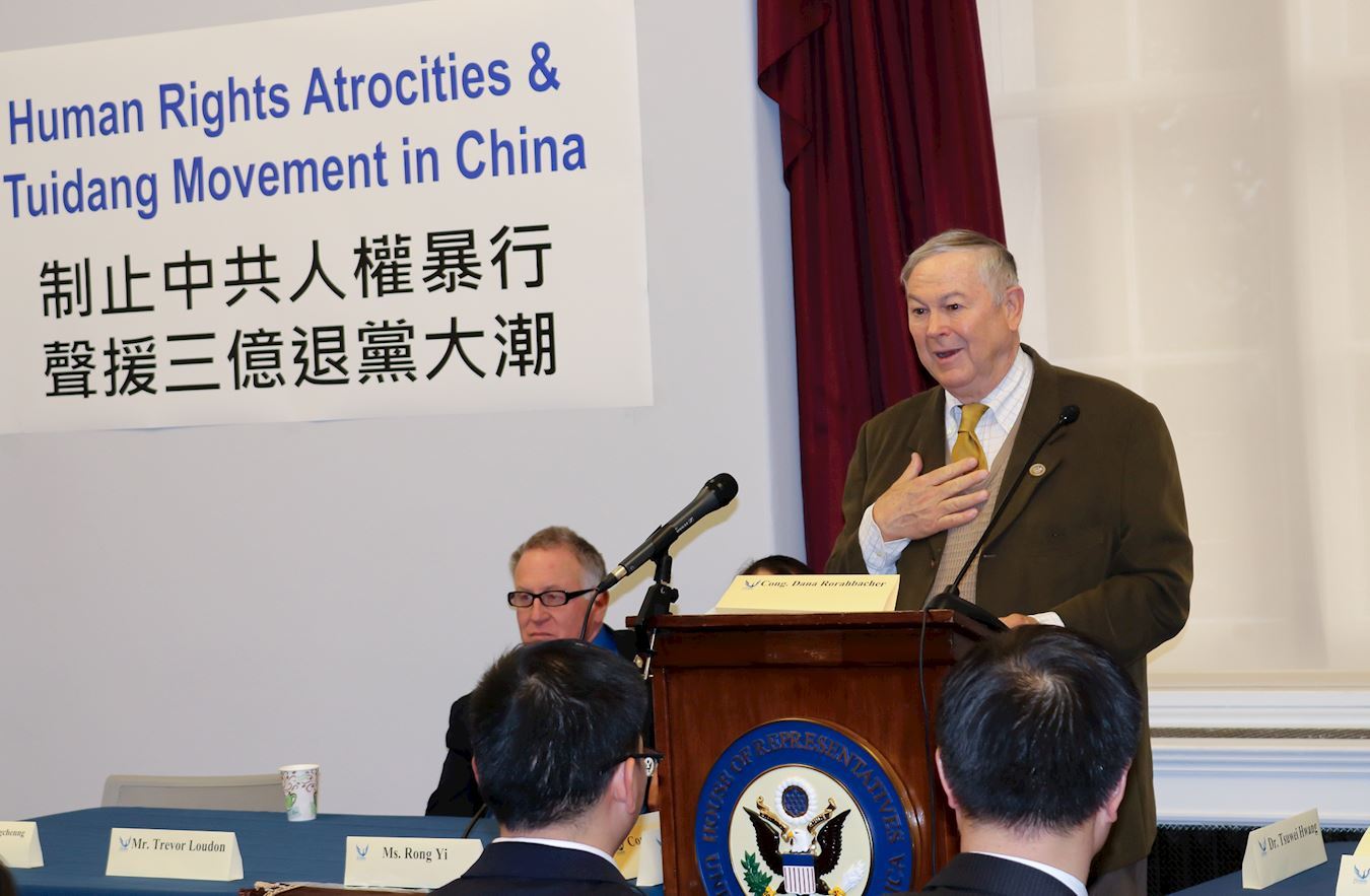 中国的退党潮引起了美国众议院资深议员达纳·罗拉巴克(Dana Rohrabacher)的关注。