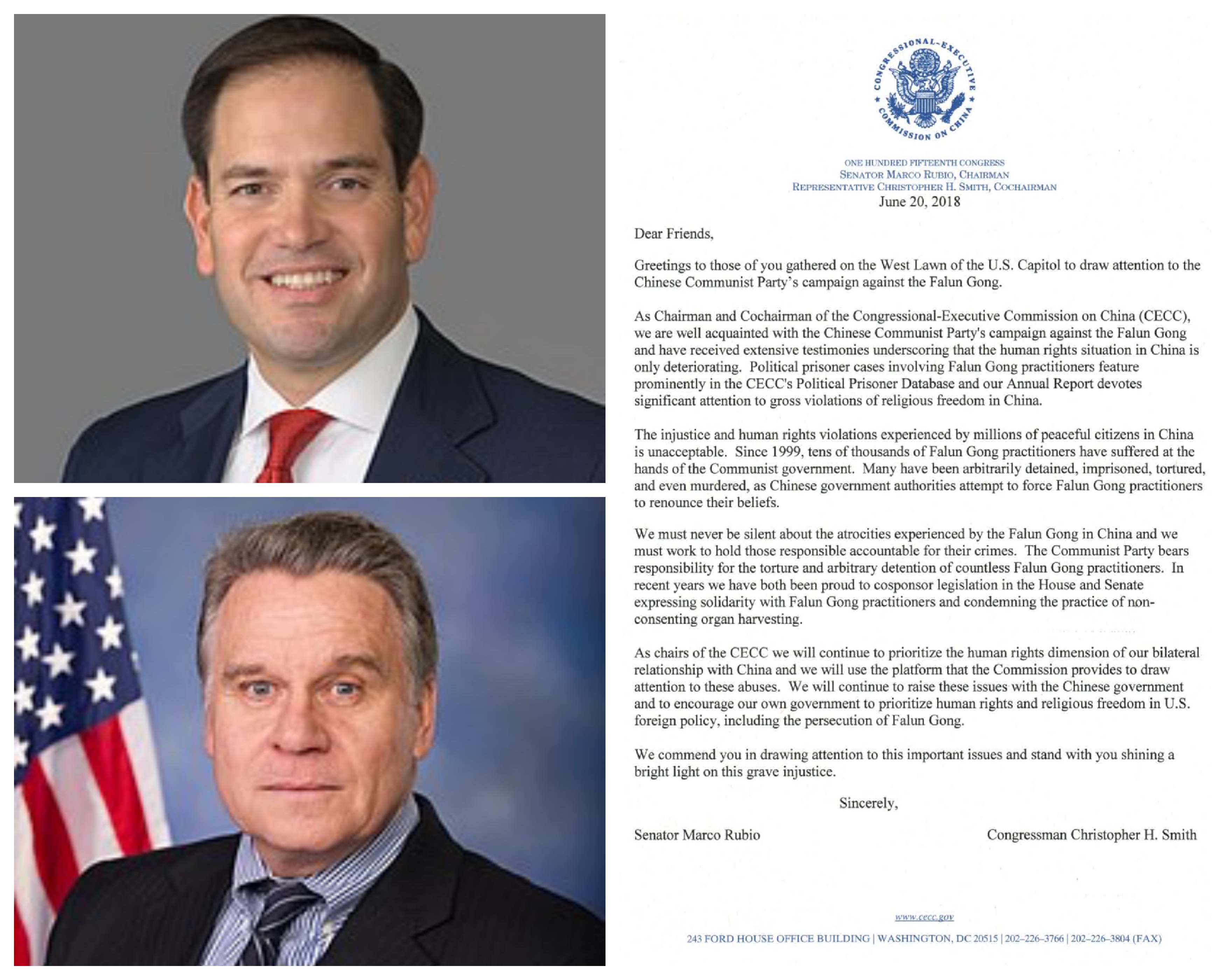 美国会及行政当局中国委员会(CECC)主席、佛罗里达州联邦参议员马尔科·卢比奥(Marco Rubio)和CECC联合主席、新泽西州联邦众议员克里斯·史密斯(Chris Smith)联名写信给法轮功学员,他们在声援信中说:“谨向在国会山西草坪集会以引起公众关注中共迫害法轮功的你们致以问候。