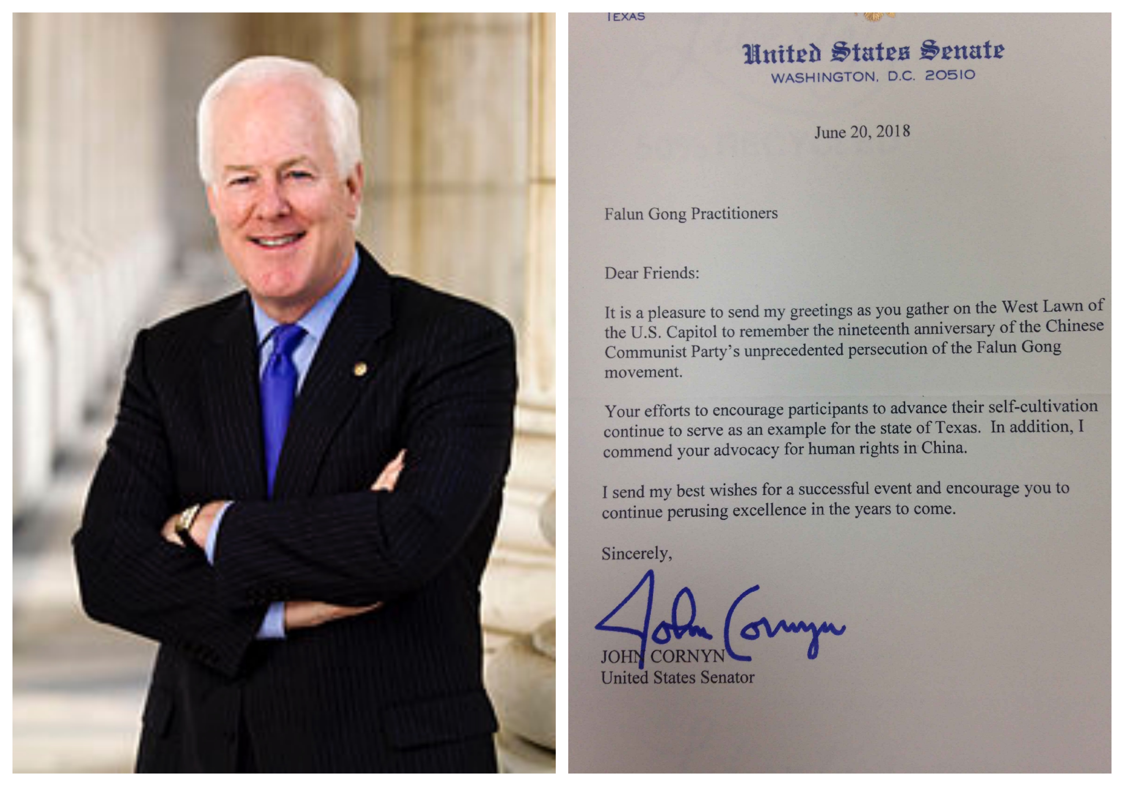 德克萨斯州联邦参议员约翰·康宁三世(John Cornyn)在给法轮功学员的声援信中说:“中共对法轮功史无前例的迫害已经进行十九年了,当你们在国会山西草坪为此举办集会时,我很荣幸能致以问候。