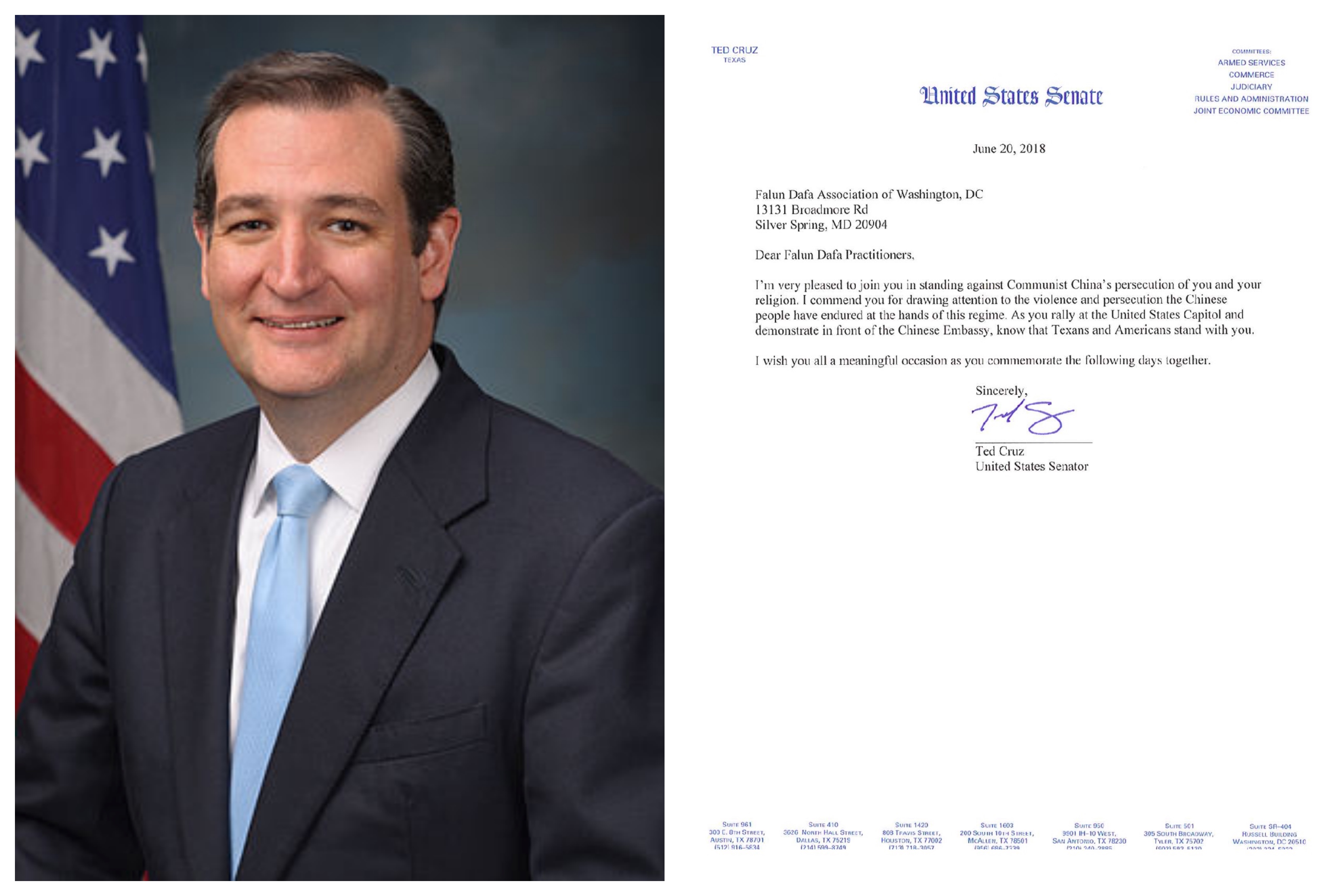 德克萨斯州联邦参议员泰德·克鲁兹(Senator Ted Cruz)在写给华盛顿特区法轮大法学会的声援信中说:“我很荣幸与你们一道,反对中共迫害你们和你们的信仰。你们让人们关注在中共统治下中国人受到的暴力和镇压,值得称赞。当你们在美国国会前集会、在中共大使馆外抗议时,请记住,德州人和美国人与你们站在一起。希望你们接下来几天聚在一起度过一段意义深长的时光。”