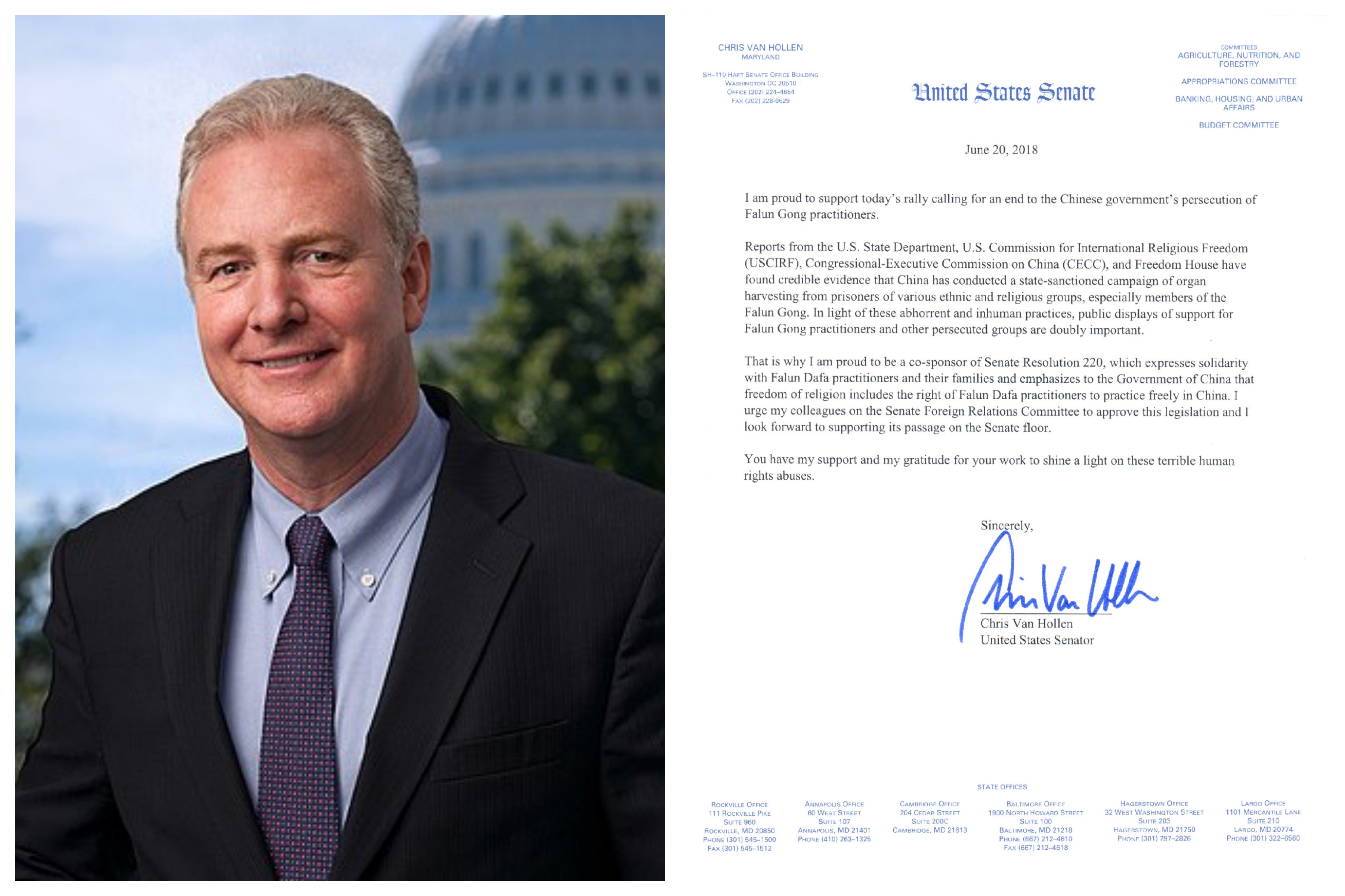 马里兰州联邦参议员克里斯·范·浩伦(Senator Chris Van Hollen)在声援信中说:“我很自豪地支持今天呼吁结束中国政府迫害法轮功学员的集会。