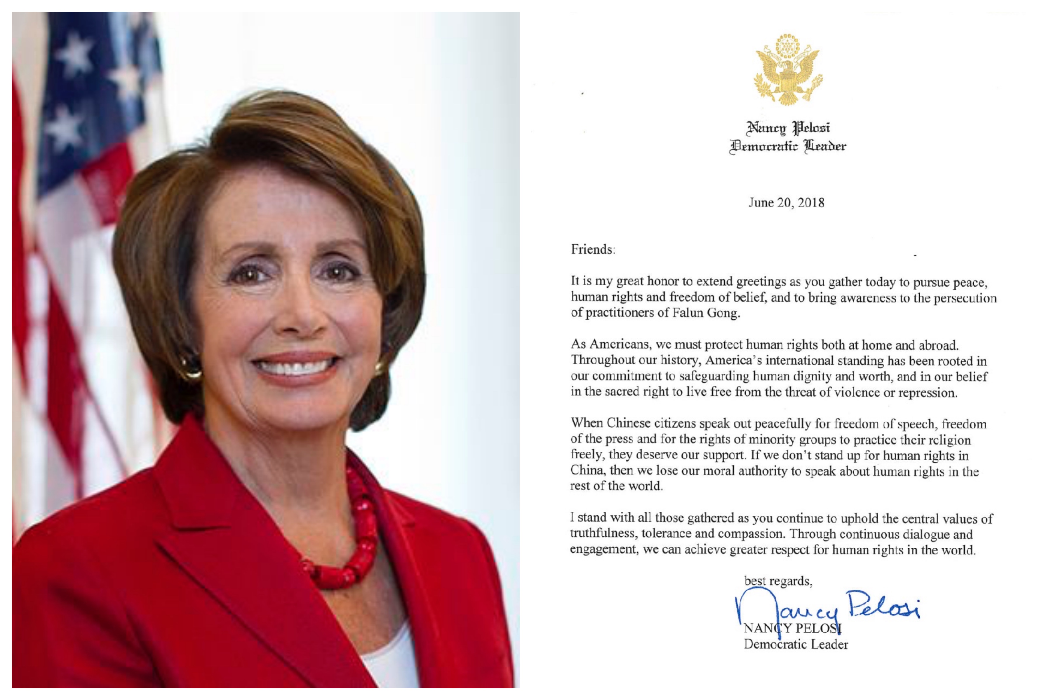 美国国会众议院少数党领袖、加州联邦众议员南希·佩洛西(Rep. Nancy Pelosi)在声援信中说:“你们今天在这里集会,追求和平、人权与信仰自由,呼吁公众关注针对法轮功的迫害,我很荣幸能够致以问候。