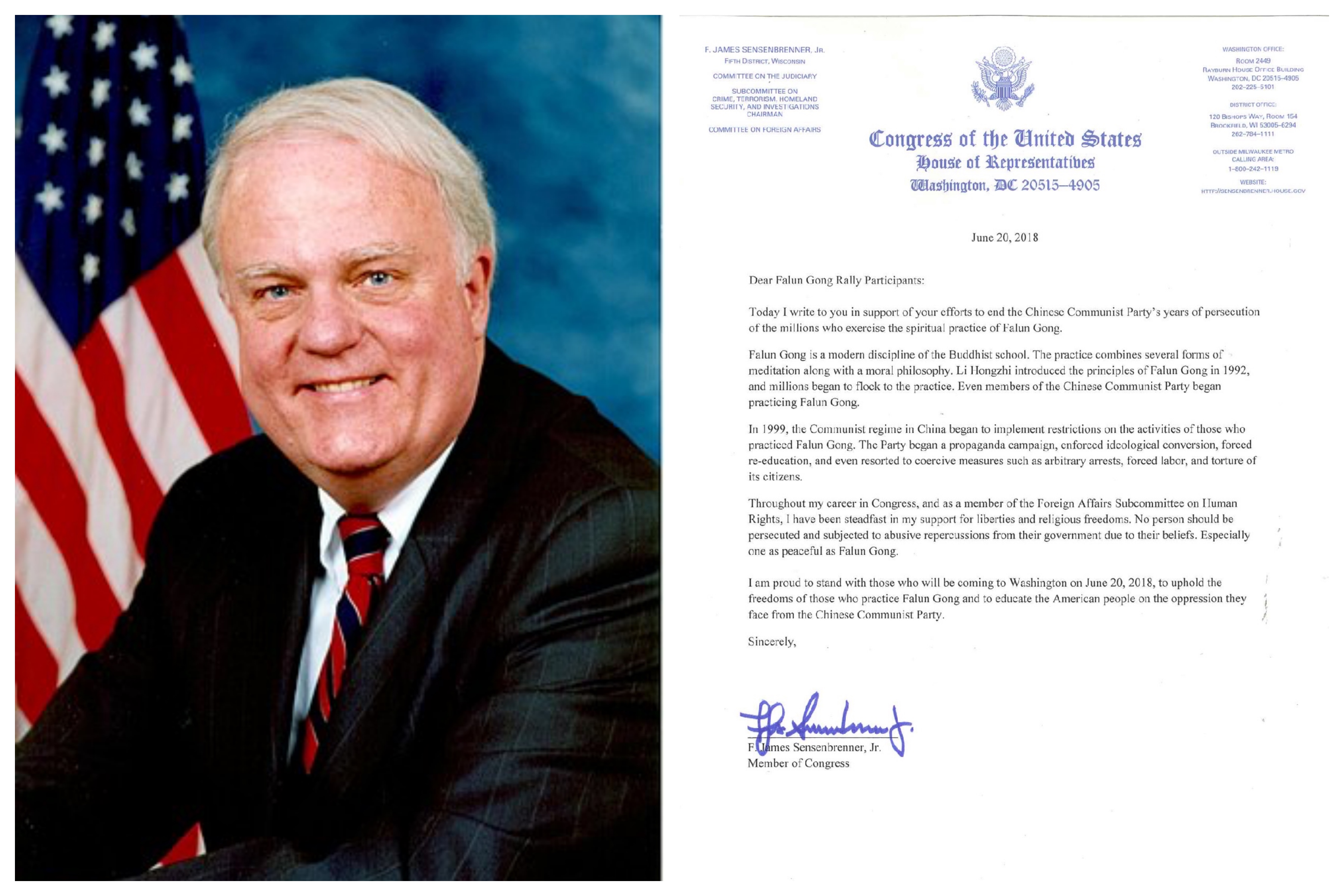 威斯康星州联邦众议员吉姆·森森布雷纳(Rep. Jim Sensenbrenner)在声援信中说:“今天,我写信支持你们为结束中共近二十年来对数百万法轮功修炼者的迫害而做出的努力。