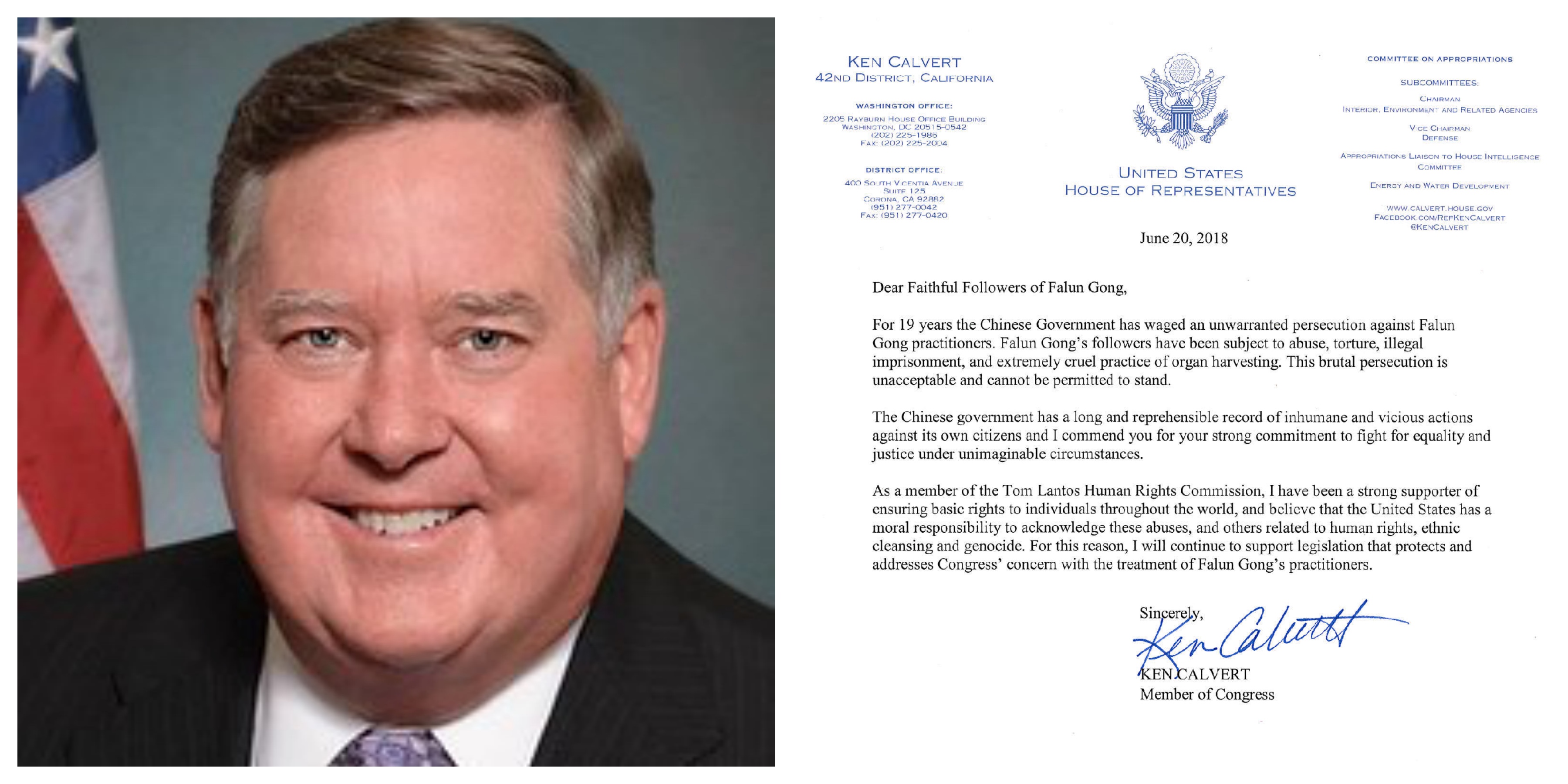 加州联邦众议员肯·卡佛特(Rep. Ken Calvert)在给法轮功学员的声援信中说:“过去十九年,中共政权对法轮功发动了一场没有理由的镇压。法轮功修炼者遭到酷刑虐待、非法关押、甚至惨无人道的活摘器官。这场残酷的迫害是无法接受的,并且不应该再被容忍下去。
