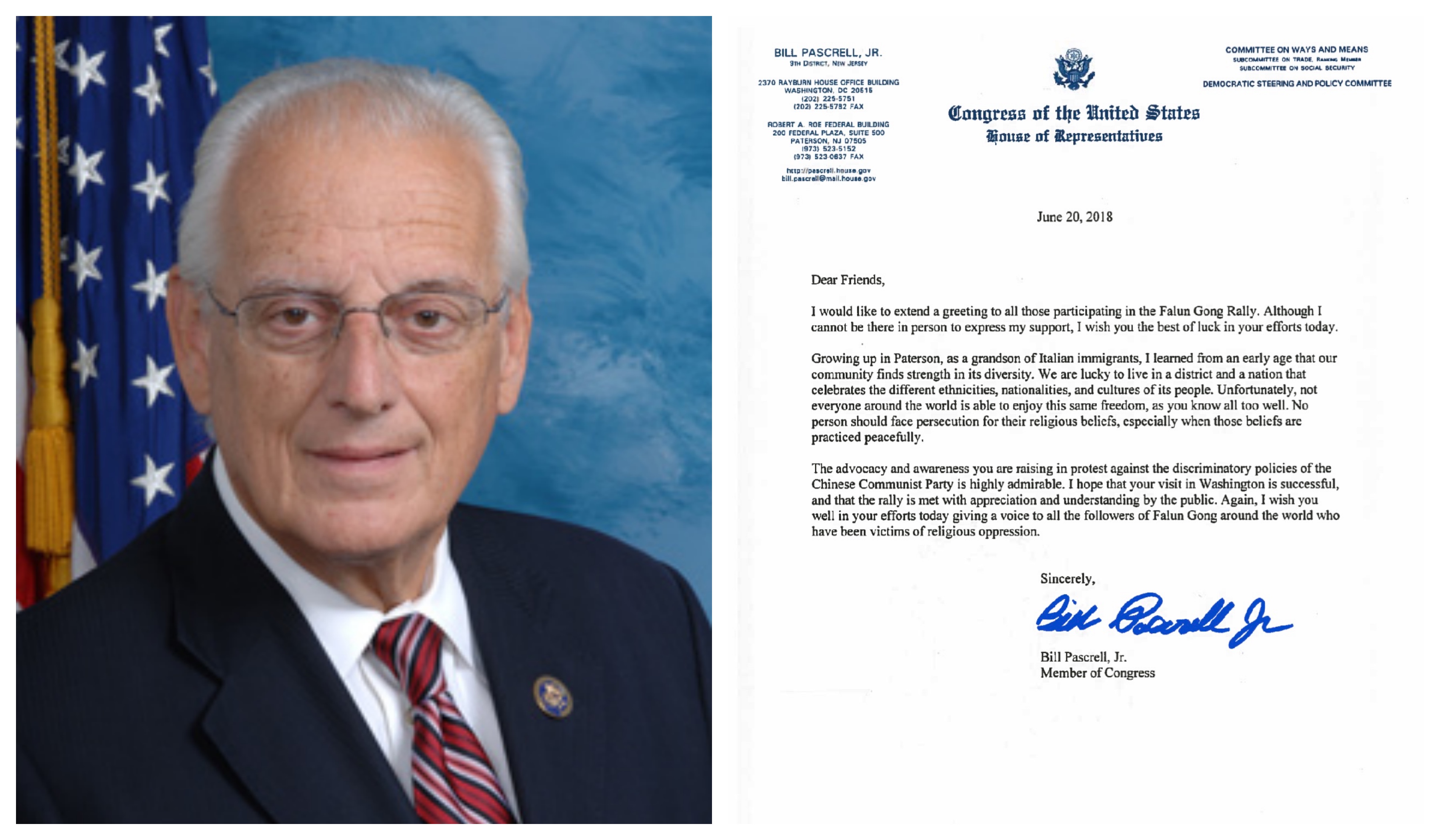 新泽西州联邦众议员比尔·帕斯克瑞尔(Rep. Bill Pascrell Jr.)在声援信中说:“我想向所有参加法轮功修炼者集会的人们致以问候。尽管我不能亲自到场表达支持,但我祝愿你们今天的活动一切顺利。