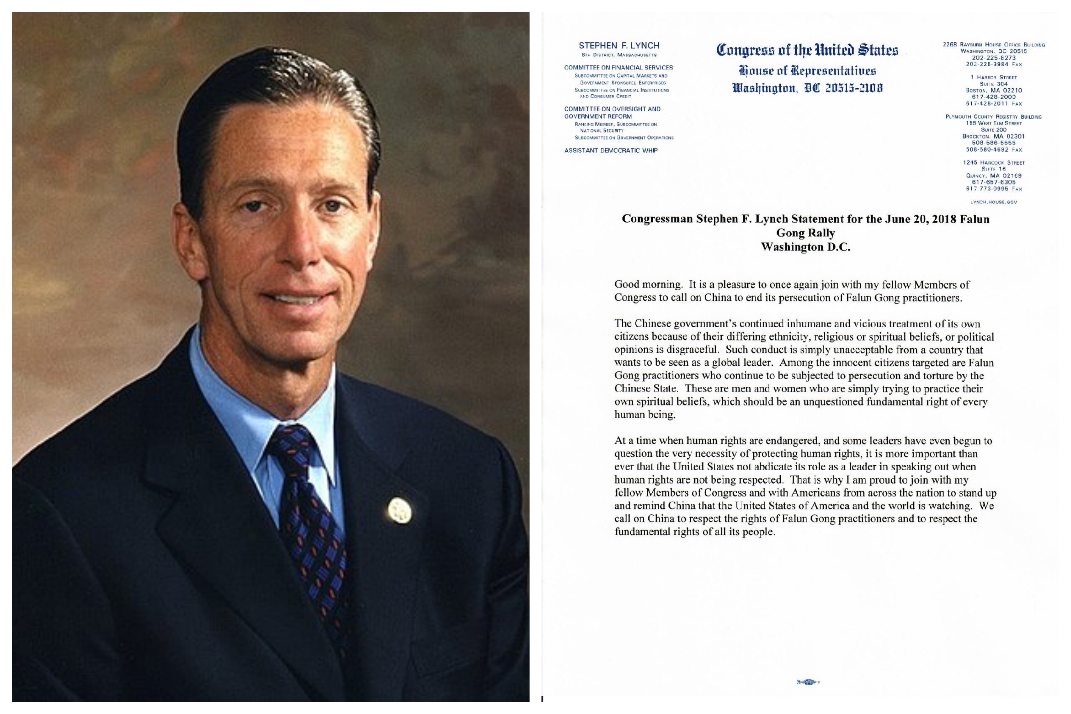 美国国会少数党副党鞭、麻萨诸塞州联邦众议员史蒂芬·林奇(Rep. Stephen Lynch)在声援信中向前来华府参加集会的法轮功学员问好,他并在声援信中说:“我为能够与我在国会的同僚一道,在这里呼吁中共结束对法轮功学员的迫害而感到非常高兴。