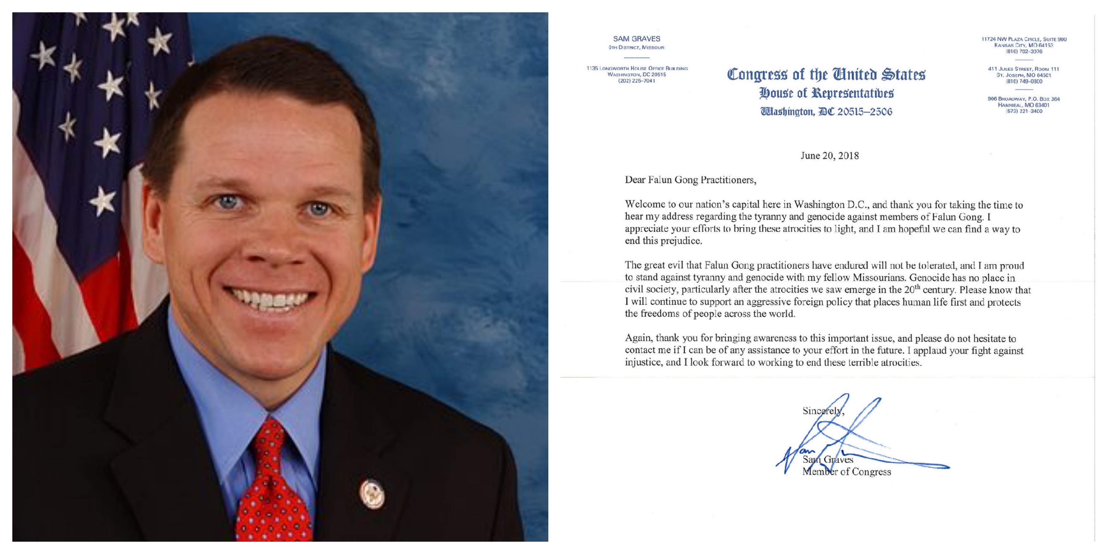 密苏里州联邦众议员山姆·格雷姆斯(Rep. Sam Graves)在致法轮功学员的声援信中说:“欢迎你们到我们美国的首都华盛顿特区来, 并谢谢你们抽时间聆听我就中共对法轮功学员的暴政和种族灭绝政策所做的讲演 。我感激你们为了将中共的这些暴行曝光所付出的努力,而且我希望我们能够找到一个结束这种暴行的方式。