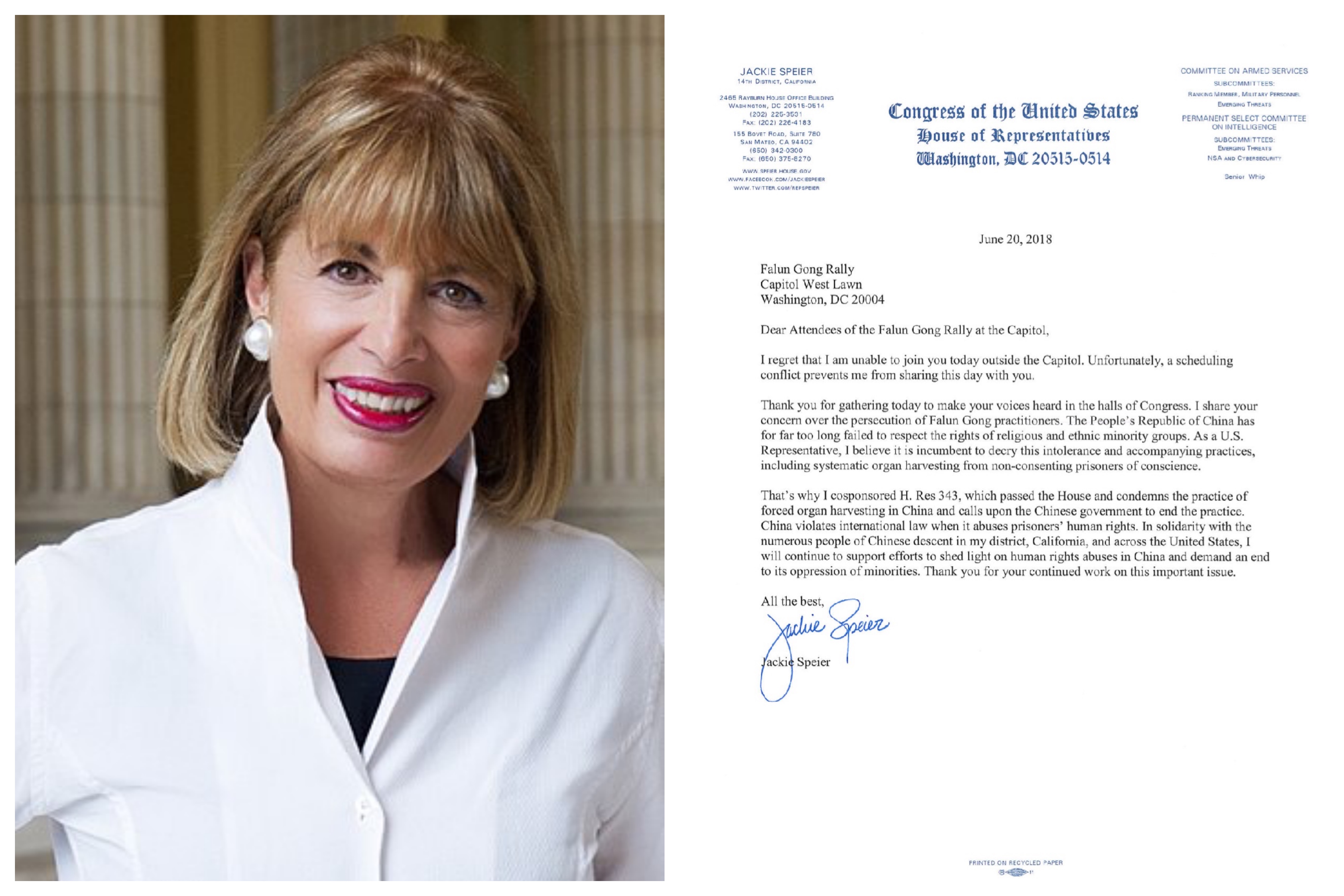 加州联邦众议员杰基·斯皮尔(Rep. Jackie Speier)在声援信中说:“在国会大厦参加法轮大法集会的人们,我很遗憾,由于时间冲突我今天没法参加你们在国会大厦外举行的集会,但是非常感谢你们今天的集会,因为这个集会能够让国会大厦听到你们的声音。