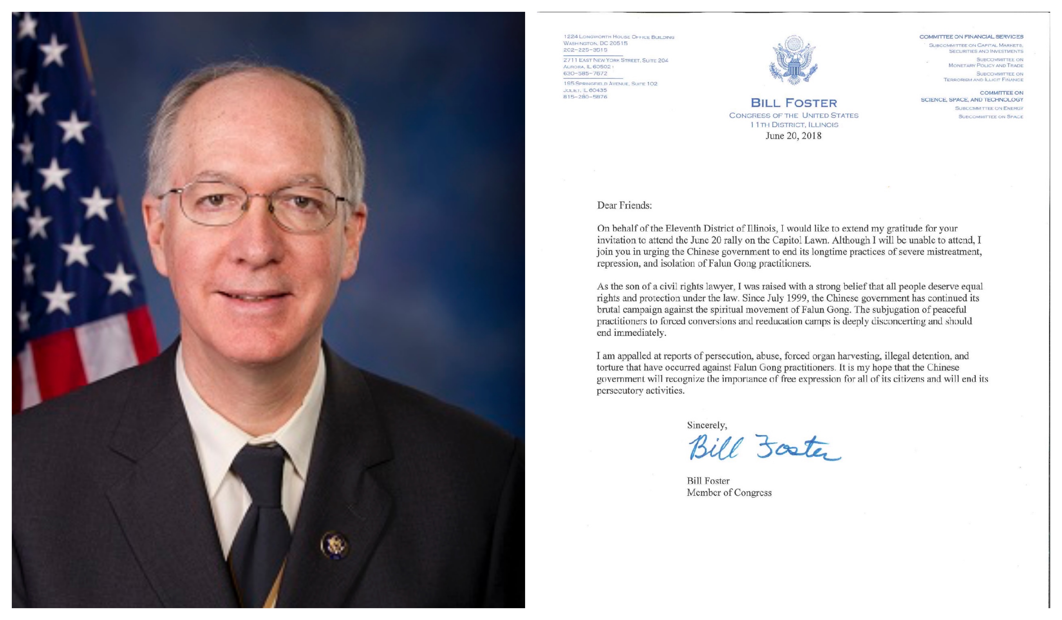 伊利诺伊州联邦众议员比尔·福斯特 (Rep. Bill Foster) 在声援信中说:“我同你一起敦促中共政府结束其长期严重虐待,镇压和孤立法轮功学员的行径。